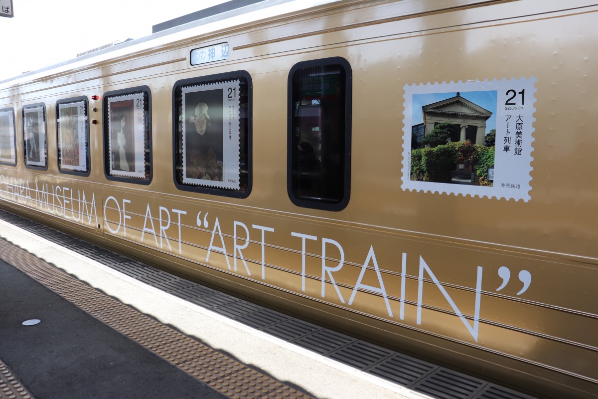岡山県倉敷市の大原美術館が所蔵する、ルノワール、モネ、ゴーギャン、エル・グレコなどの名画32作品、42点を車両にラッピングした井原鉄道のアート列車の運行が始まりました。車両の内外に、津山市の現代美術家、太田三郎さん(70)が郵便切手風にアレンジしてあしらわれています。車両の改装費は、昨年11月に、クラウドファインディングで募集し目標額の250万円を上回る721万円が集まったことも話題になりました。運行時間は、日によって違うので、井原鉄道公式サイトの運行時刻表でご確認ください。