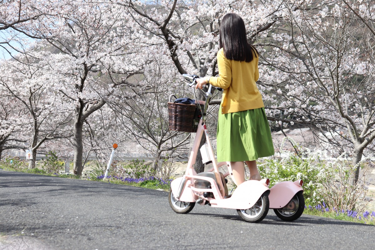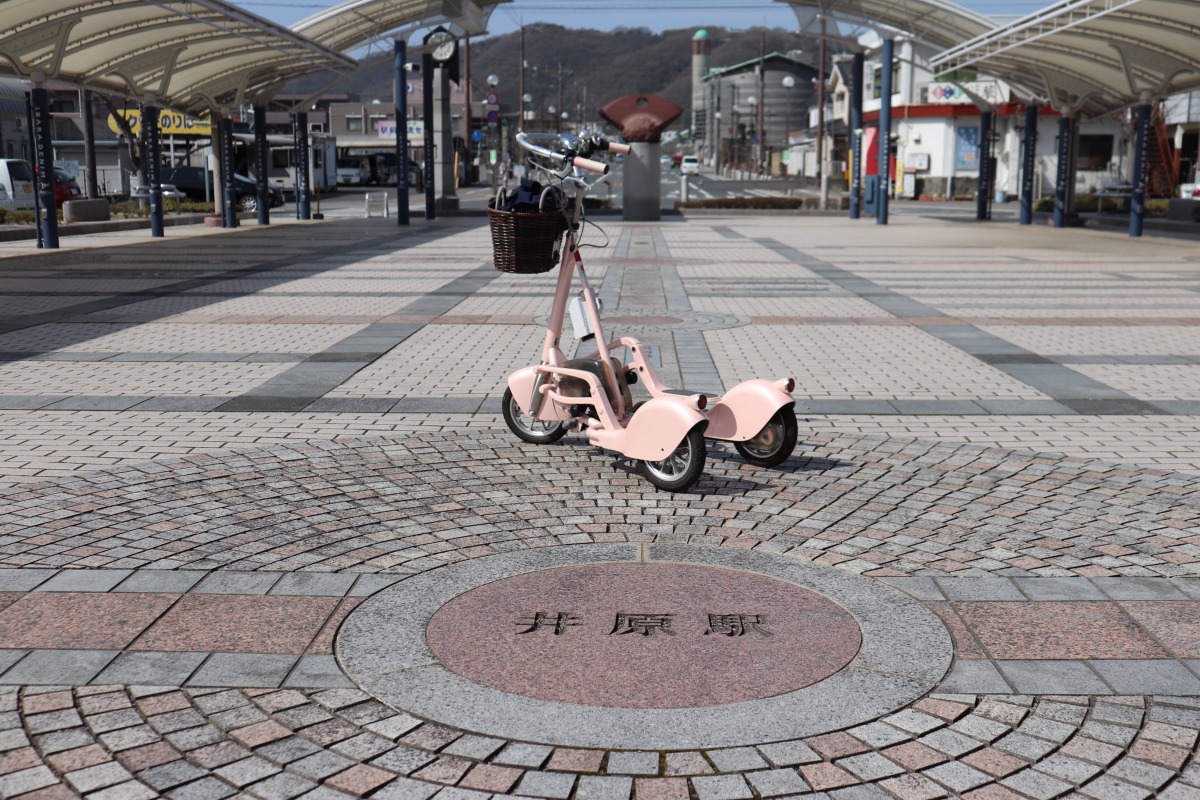 2月にも取材でお借りしたした、電動アシスト付きウォーキングバイシクルを今回もレンタルしました。今回は、桜の取材に合わせて桜色をレンタルしました。井原駅の井原観光案内所にて無料でレンタサイクルできましたが、4月からは料金がかかるかもしれないそうです。