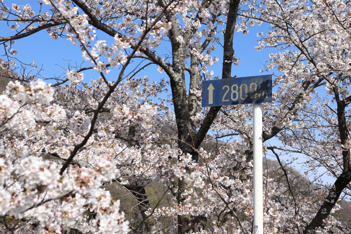 桜の木の中に、2,800mの看板を見つけました。「2,800m!?長い!!ウォーキングバイシクルで正解! 笑」