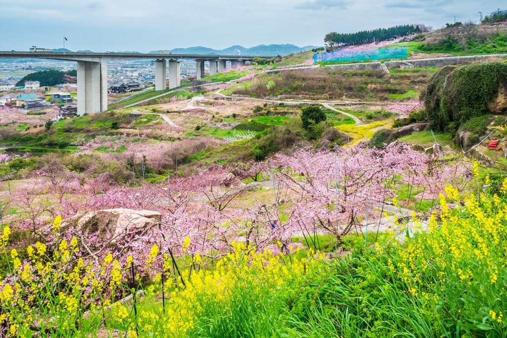 玉島八島・富田地区は南向きの丘陵を活かした桃の栽培が盛んです。山陽自動車道北側の桃畑がピンク色に染まり、黄色い菜の花や白い梨の花とのコラボも楽しめます。