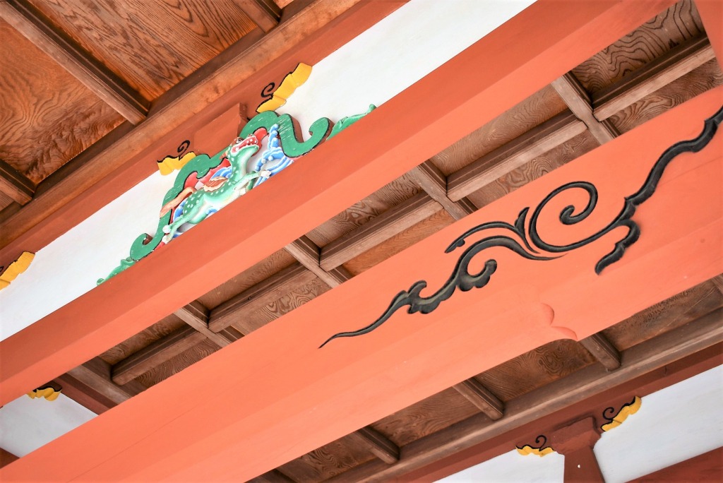 県の重要文化財でもある鐘を擁する鐘楼門。はなやかな柱の朱のデザイン。