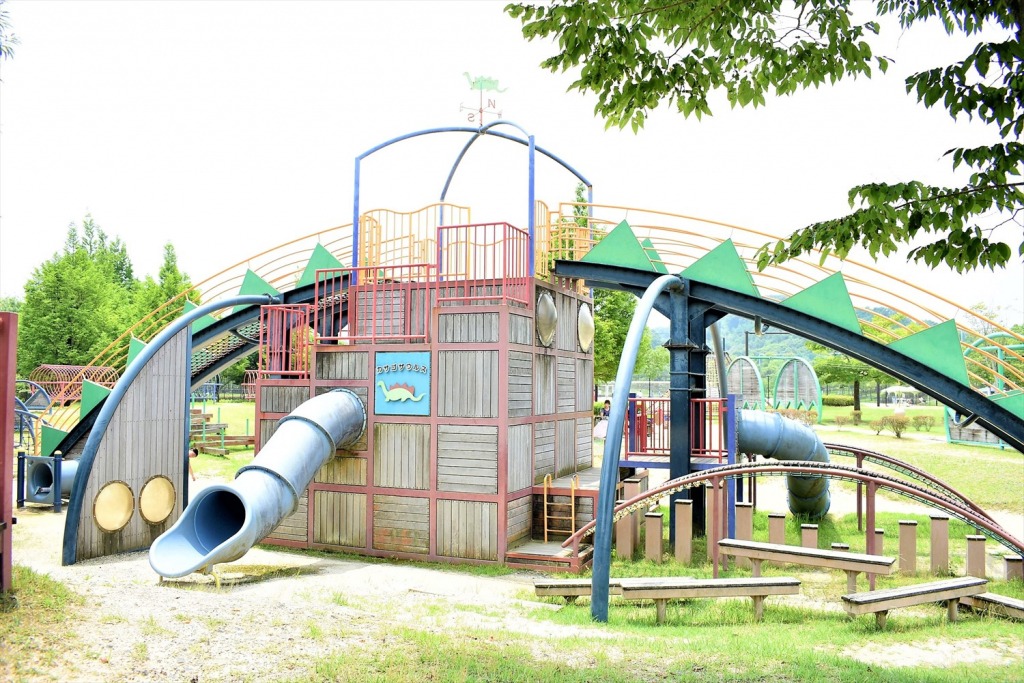 公園の入口には高床式住居風の展望台。とにかくよく滑るローラーすべり台を滑り降りると遊具のエリアです。ヘビのような長いトンネル遊具、恐竜のたまご型のターザンロープ、カサゴサウルスのかたちの大型遊具と目白押し。トイレには勾玉の装飾がデザインされていました。