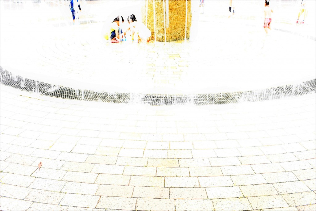 噴水のある広場までの道のりは、神殿へのエントランスのようでした。黄金にかがやく塔のまわりを囲う円からは勢いよく水が噴き出します。水量もたっぷりなので、幻想的な光景です。水浴びし放題です。