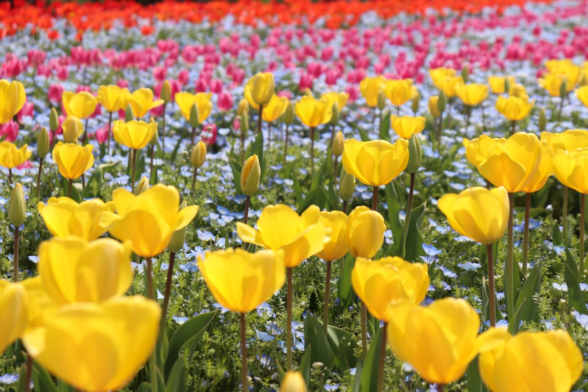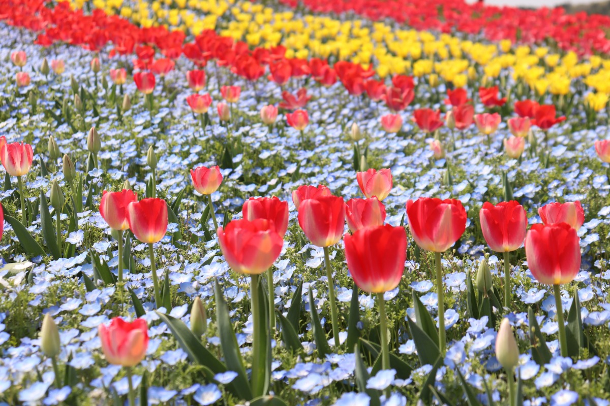 ネモフィラの間にチューリップを植えられたそうです。チューリップの虹ができていてきれいでした。たくさんのカメラマンさんが写真を撮られていました。