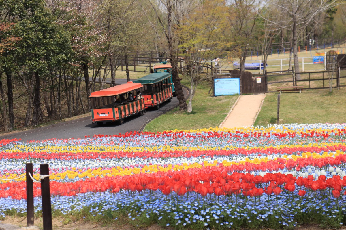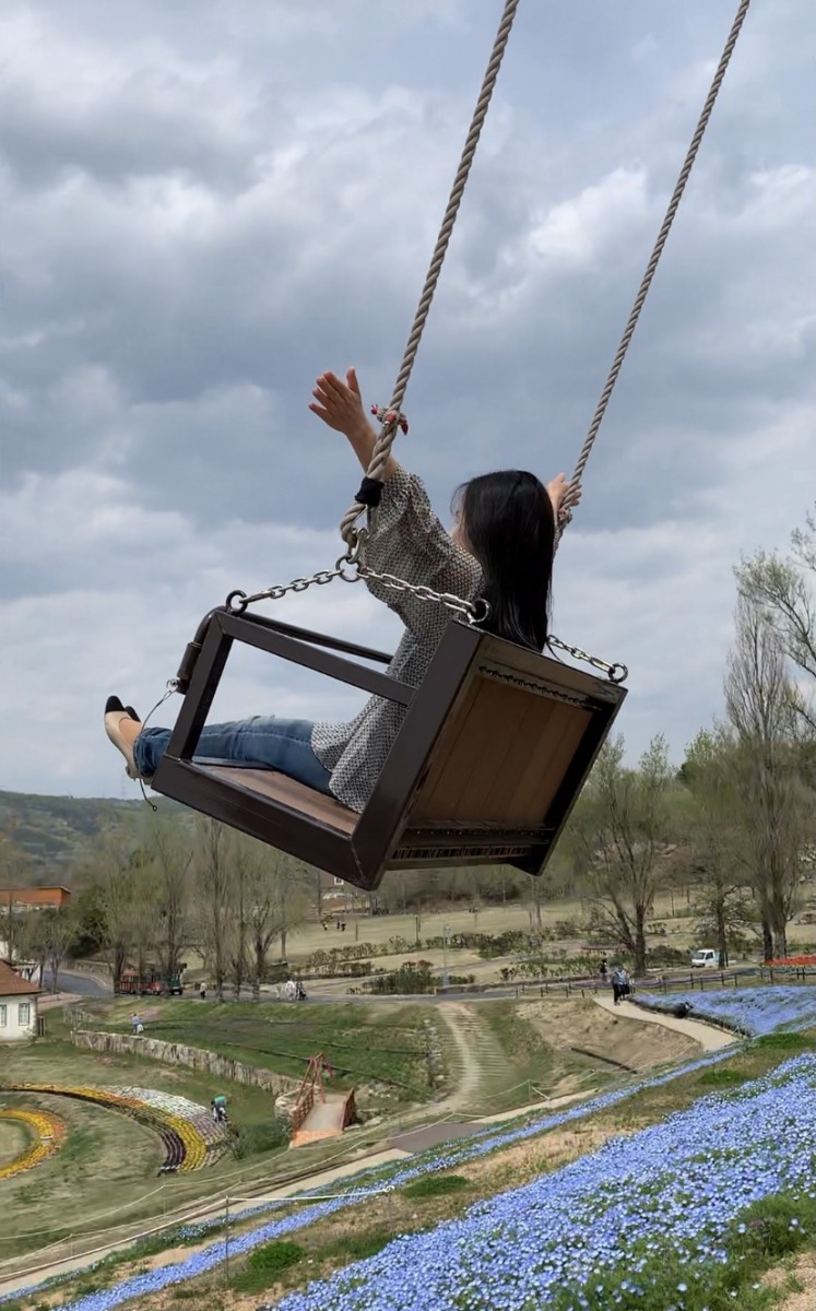 チューリップ、菜の花、ネモフィラが見頃を迎えた「フォレストパークドイツの森」のアトラクション、「ハイジのブランコ」が人気です。