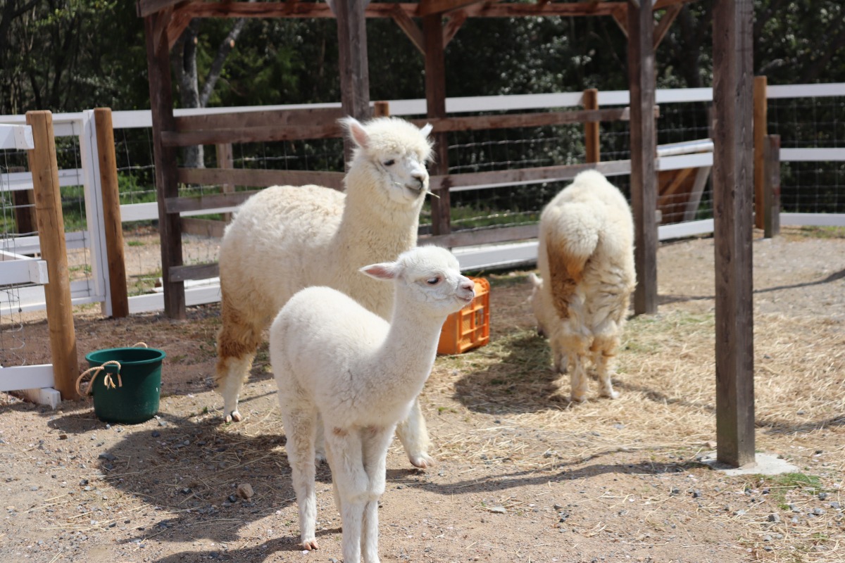 乗馬体験のエリアには動物ふれあい広場がありました。アルパカのお母さんルーシー、姉妹のエミリーとシェリーに会いました。お父さんハーシーは、情緒不安定で、唾を吐くので、別の場所にいました。動物たちの紹介看板もユーモアがあって面白いですよ。