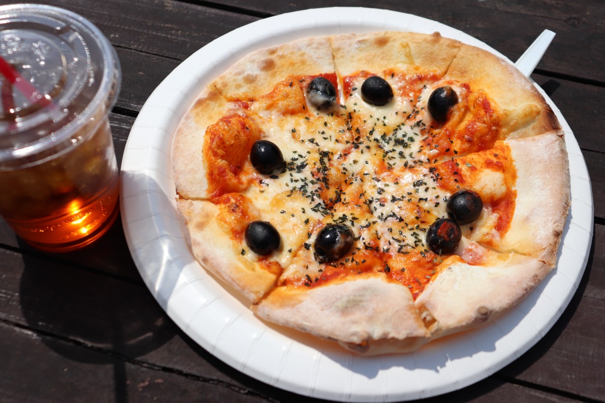 村エリアの石窯パン&ピザ工房「ベルク」で焼き立てピザを頂きました。オープンテラスでピクニック気分です。美味しい~!