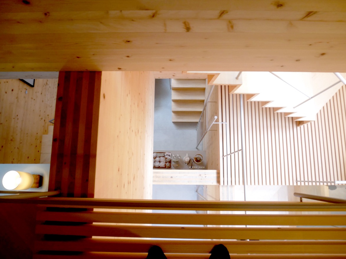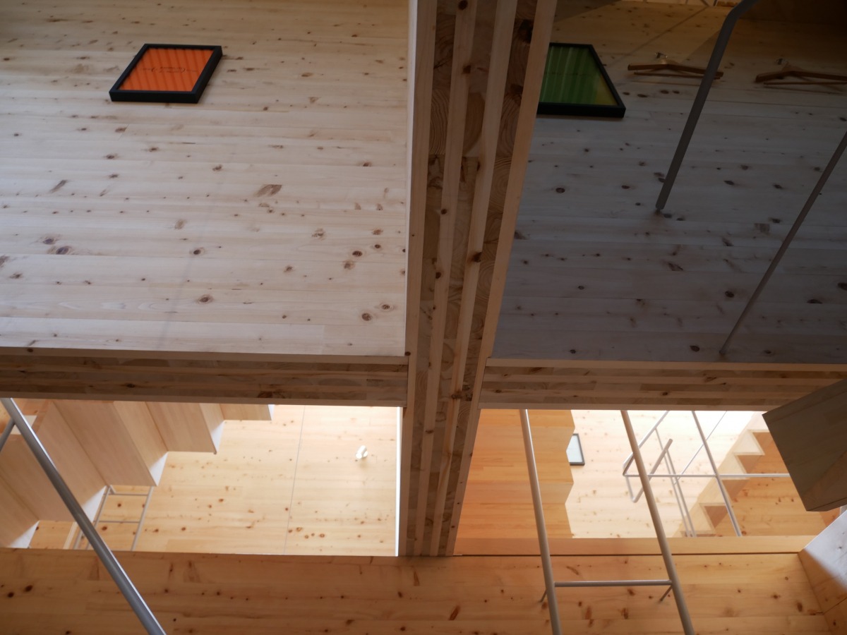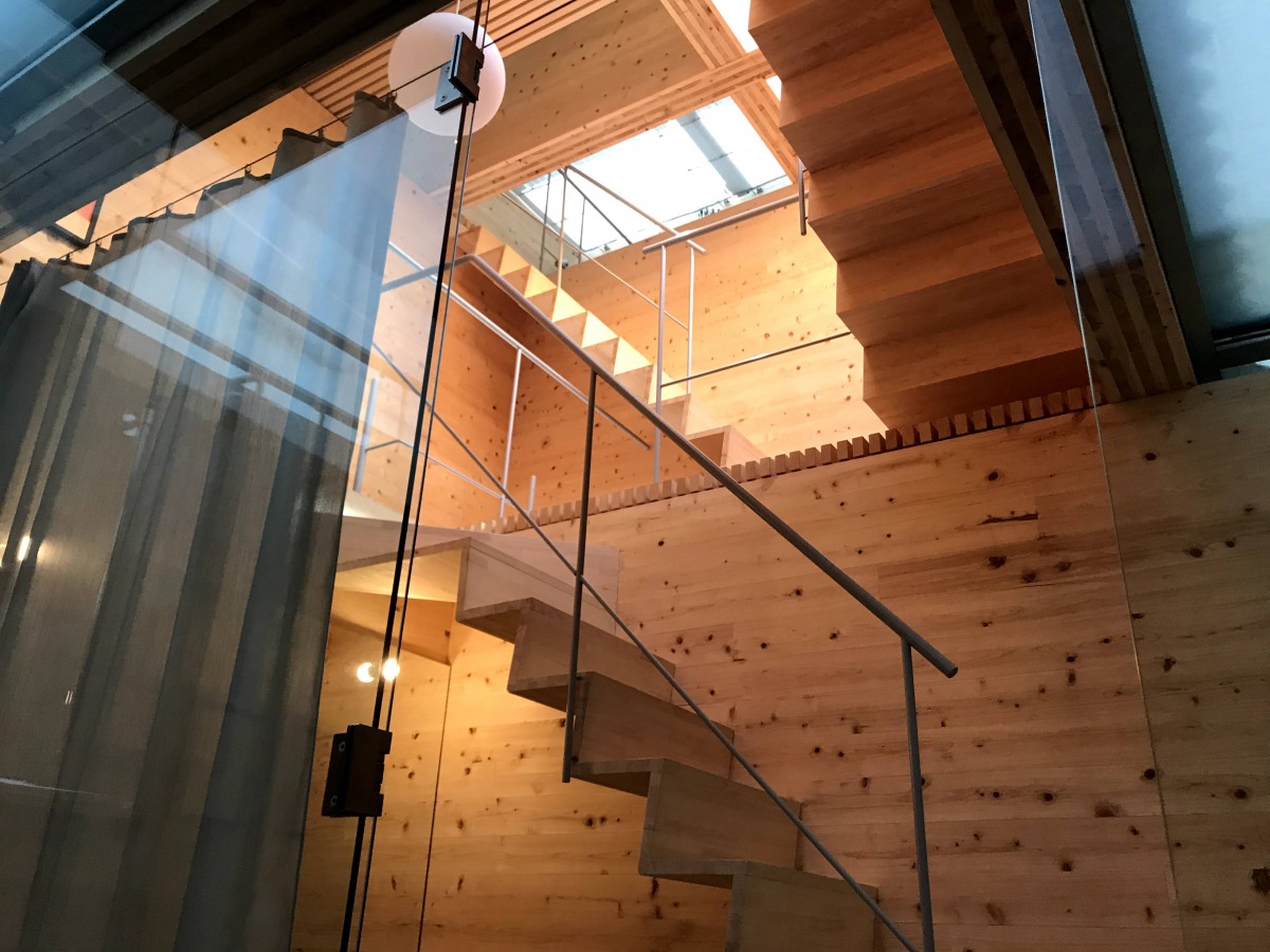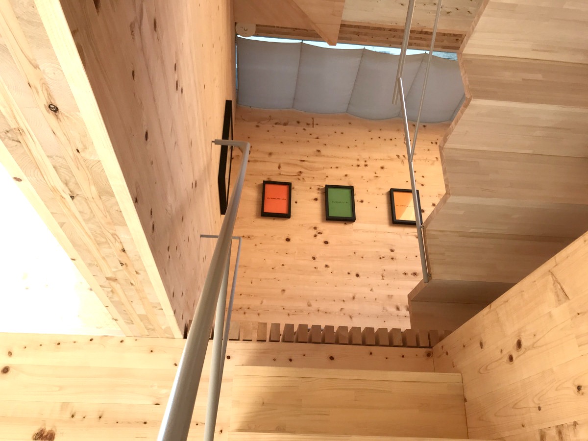 「巨大な分厚いCLTを田の字に組んだフレームを三段積み上げた」という構造の説明を見ても、滞在前はピンときませんでしたが、ホテル担当の阿部さんに詳しく教えていただくとよくわかりました。改めて建物の外と中を探検すると、確かにフレームが「ズラしながら三段」積み上がっていました。