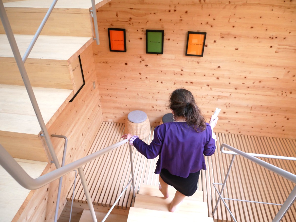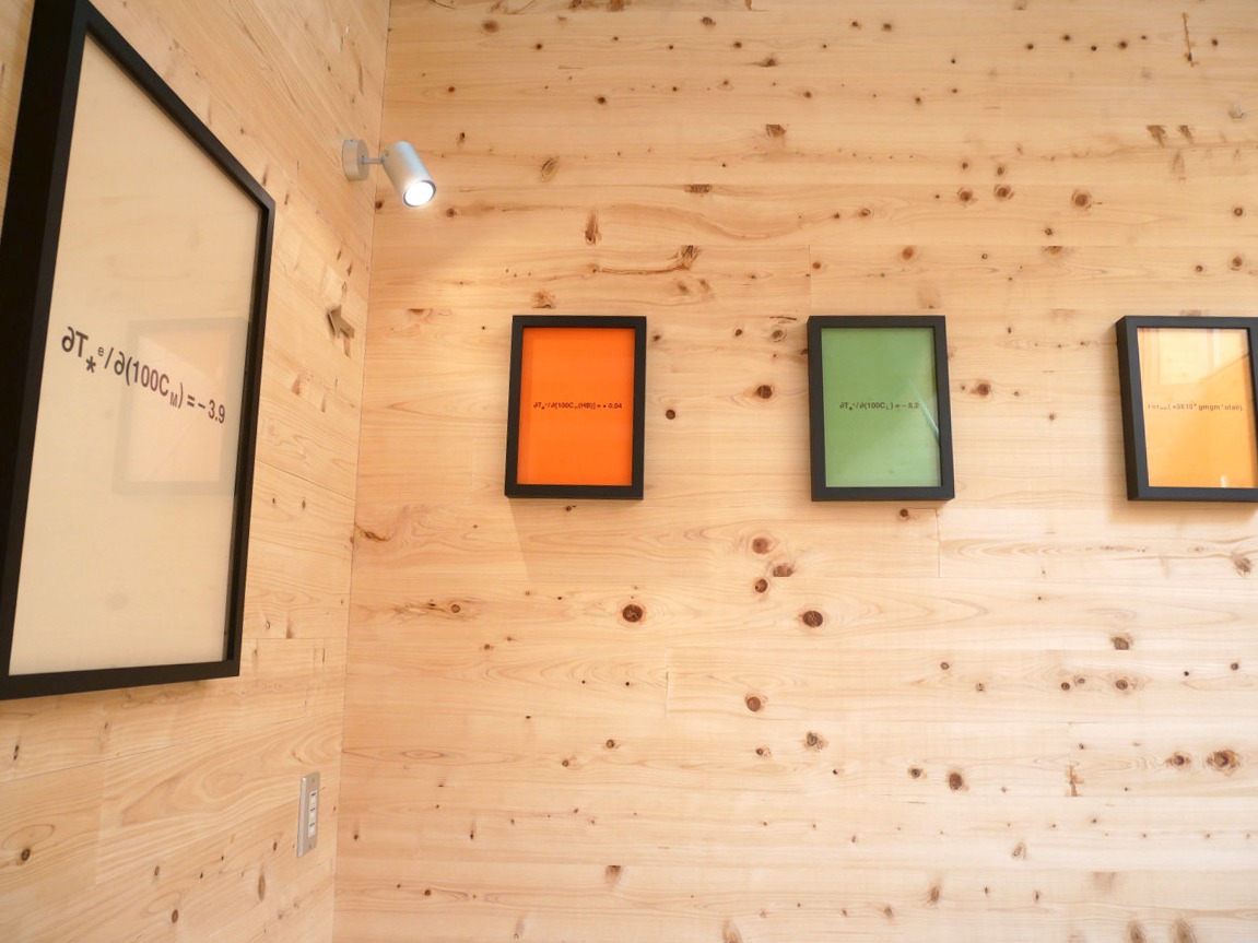 数式が書かれたカラフルなフレームが導線を彩り、木の空間を際立たせていました。
