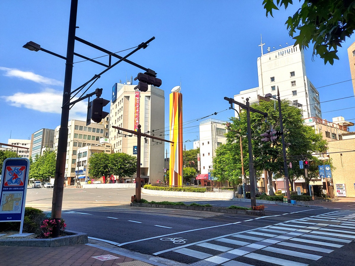 最寄駅の地下道「しろちか」から、空に向かって突き立っているシンボルタワーのカラフルなデザインは、岡山芸術交流2016のアーティスティックディレクターであり、ホテルデザインに関わったリアム・ギリック氏の作品『多面体的開発』。