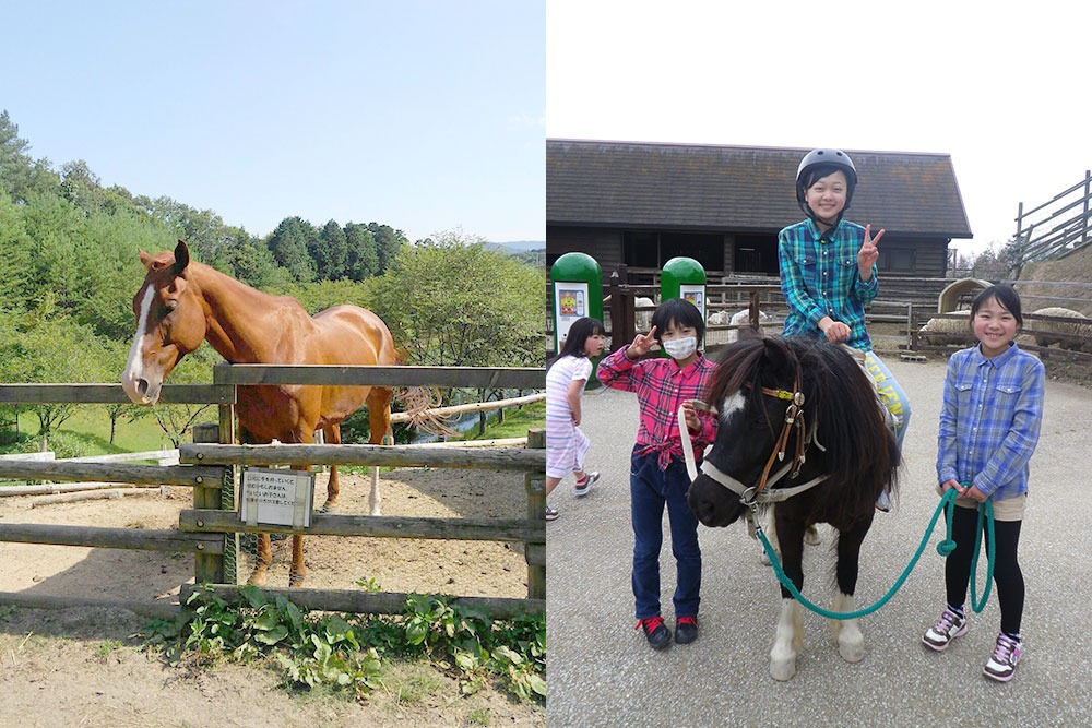 スタッフが綱を引いて誘導してくれるので、お子様や乗馬初心者も安心。自然の中でふれあう動物と、普段できない体験で心も体もリフレッシュ! 馬に乗った後はごほうびのエサやり体験も楽しめます。