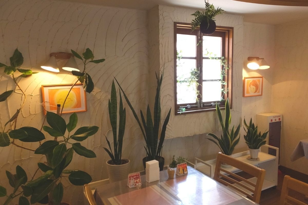 店内は緑や絵が飾られており、どこかそよ風を感じられそうな内装。あたたかみを感じる絵は全て“特定非営利活動法人 星とたんぽぽ”さんから提供されたもので、どこの席からでも眺められるような配置をされています。