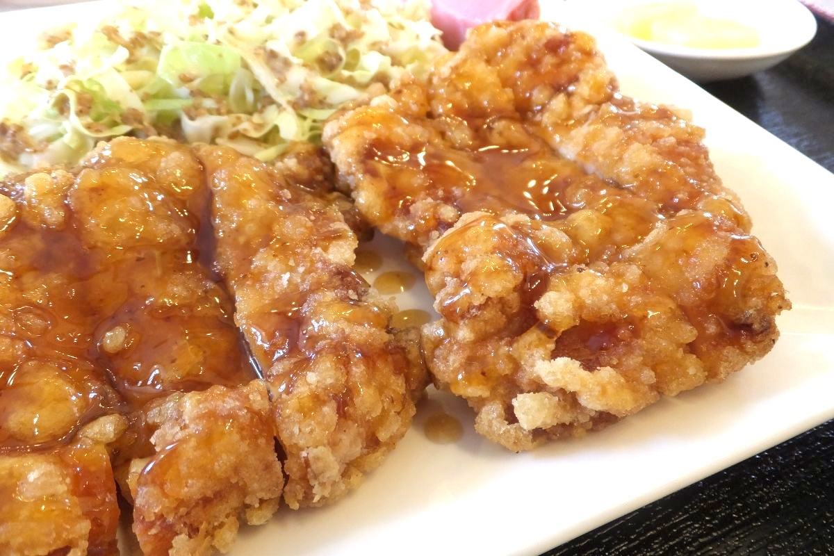 カフェレストランそよ風の人気メニューは鶏南蛮定食。カラッと揚がったサクサクのチキンに、濃厚な甘辛ダレがよく絡んでいて美味しかったです。ご飯と味噌汁、漬物までついて税込600円と値段もリーズナブルでした。店内には小さな子ども用のイスもあり、家族で気軽に食事ができますよ。