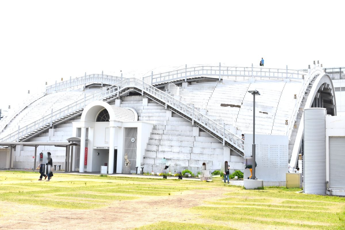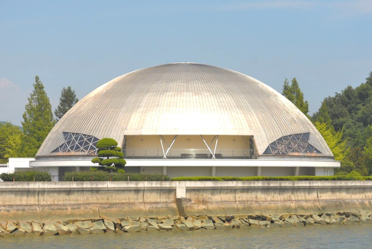 ドーム屋根がまるごと太鼓橋!?実は階段状になっていて、イベント時には渡ることができます。天井裏には、和テイストな風俗画。全体的な造形デザインには、多くの世界遺産を遺したイタリアの建築家・パラディオの建築様式。と、多文化の架け橋のような、交流センターです。岡山の、自由で、独特な現代建築。楽しくめぐってみてくださいね!