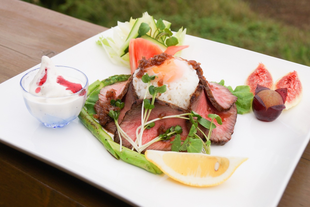 湖畔を眺めながら過ごせる「そばカフェ木楽」は、店主が厳選した国産そばの実を使用した石臼挽きの手打ちそばが楽しめる一軒。そんな、こだわりそばと共にこちらで味わえるのが、肉の旨みと甘みが凝縮された奈義町の特産品・なぎビーフのメニューです。ローストビーフに季節の野菜やフルーツを添えて提供される「ローストビーフプレイト」(1,800円)は、さっぱりしているのにコクのある赤身肉が絶品。数量限定の「なぎビーフステーキ丼」(1,700円)や、そばもステーキ丼も両方味わえる「木楽セット」(2,200円)も人気です。