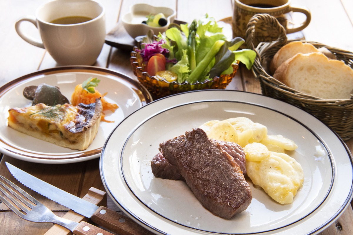 国道53号線沿いに建つ「Cafe&Deli CHURRO」は、町内で採れた食材をふんだんに取り入れた料理を提供するカフェレストランです。フランス料理から昔ながらの洋食まで、季節の食材を使って盛り付けられた料理は、見た目も鮮やかで食べるのが楽しくなります。なぎビーフを使ったメニューは、「頬肉の赤ワイン煮込」(1,800円)や「もも肉のロースト」(2,500円)など。仕入れ状況でメニューが替わるので、ご予約時にお問い合わせ下さい。