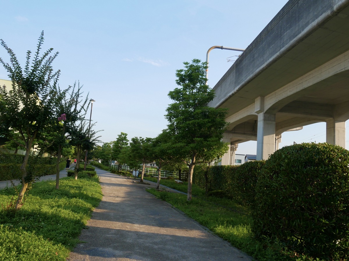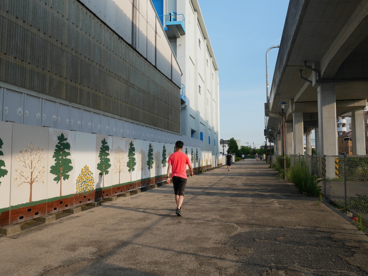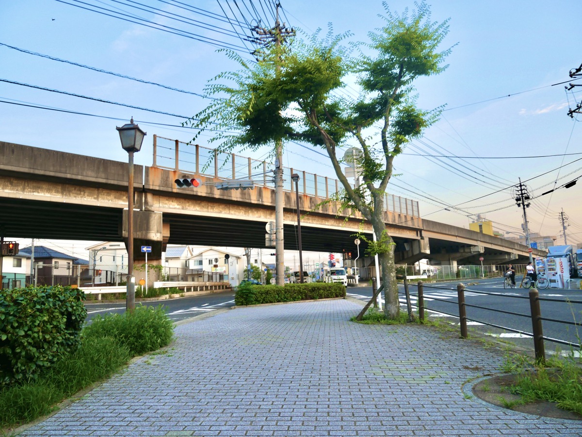 鉄道跡は、今では道路、住宅や企業が建ち、一部は遊歩道へと姿を変えました。今回はこの遊歩道に向かって、JR大元駅から南へ南へと歩いてみることに。撮影時は7月の少し涼しくなった夕方。ランニング、散歩する人も多かったです。
