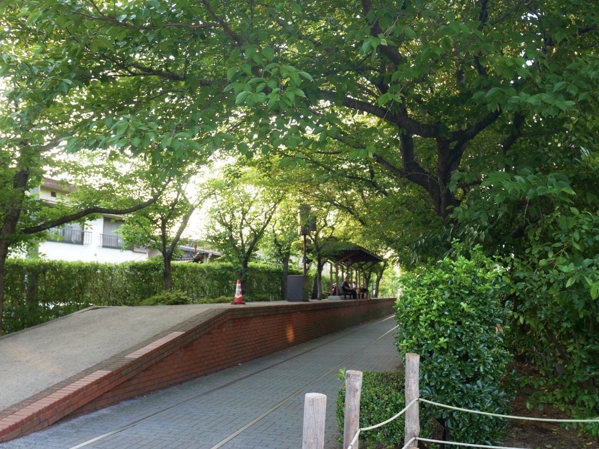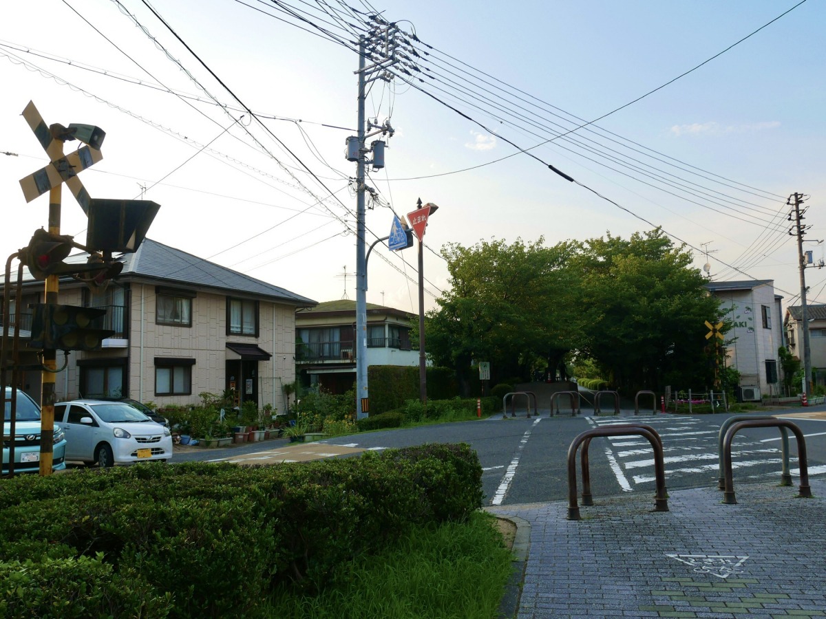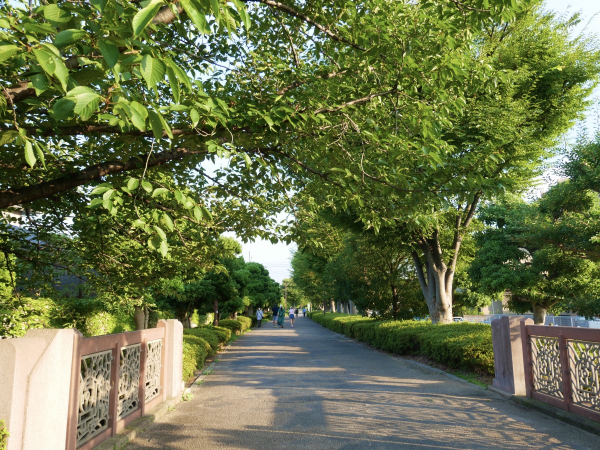 鉄道跡は、今では道路、住宅や企業が建ち、一部は遊歩道へと姿を変えました。今回はこの遊歩道に向かって、JR大元駅から南へ南へと歩いてみることに。撮影時は7月の少し涼しくなった夕方。ランニング、散歩する人も多かったです。