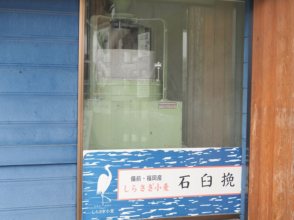 どのように石臼挽きの小麦粉に行きついたのでしょう。1993年以降、「日本の伝統食であるうどんを国産小麦で作れないか?」と、さまざまなチャレンジを重ねてきた一文字うどん。うどんに合う国産小麦を探し、隣町で「しらさぎ小麦」を発見! けれど地場流通はしていない・・・「だったら自分たちの田んぼで育てよう!」と小麦の栽培をスタート。しらさぎ小麦はできたけれど、少量を製粉してくれる会社がない・・・「だったら自分たちで製粉しよう!」と石臼製粉機を導入したのです。