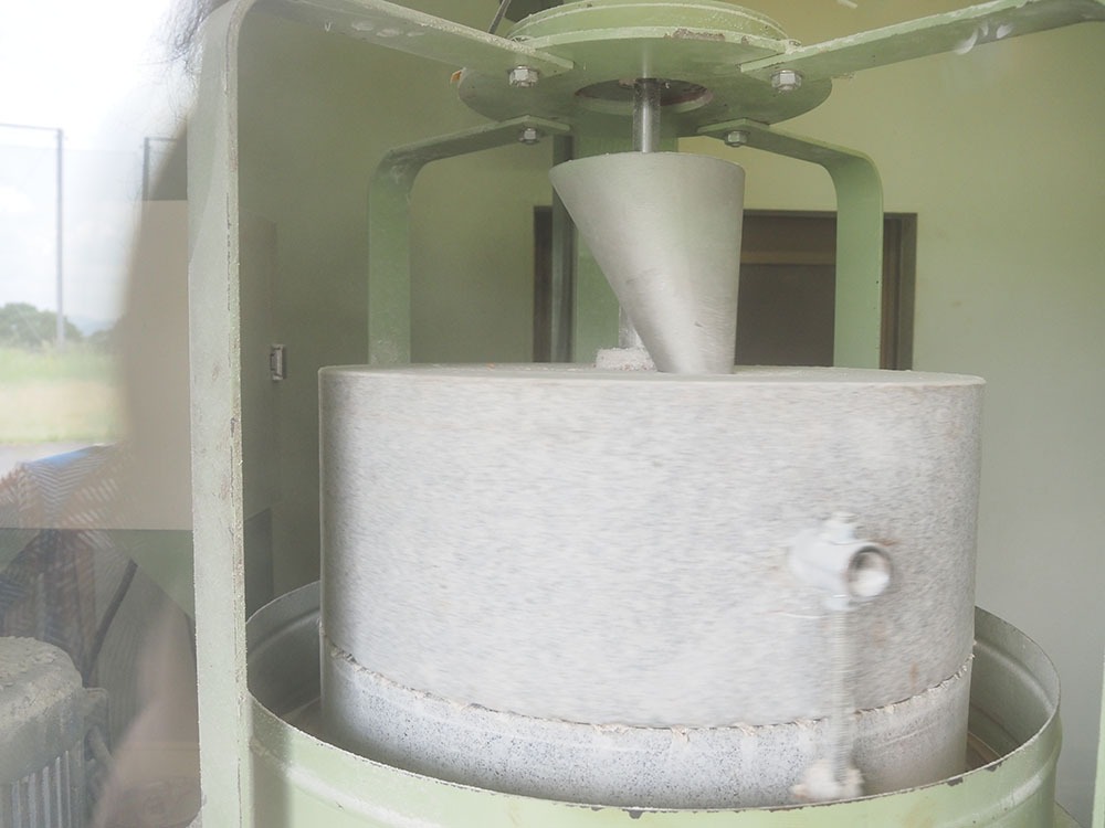 一文字うどんのうどんは、自家製石臼製粉の小麦粉で作られています。訪れたときも店先ではゆっくりと石臼が回り、小麦を粉状に挽いていました。