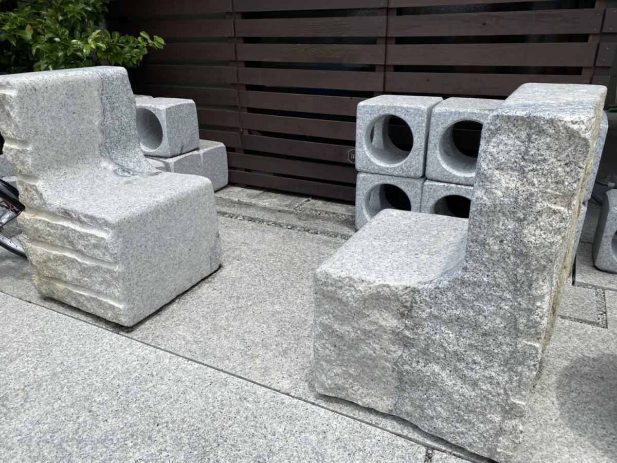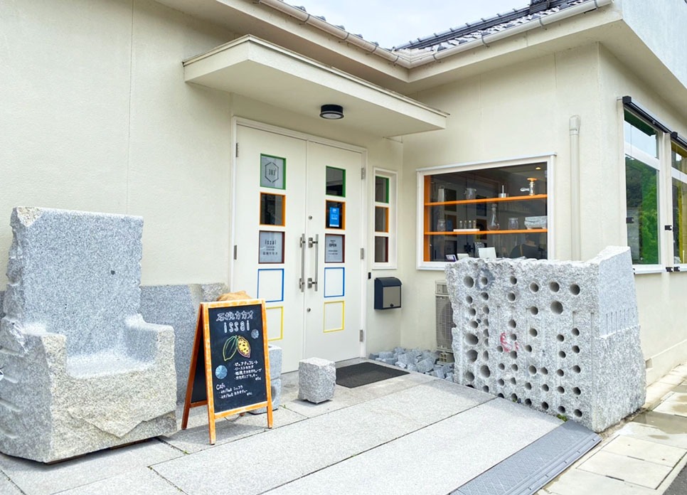 お店の外には矢掛産の石を使った椅子型のアートが! 休憩スポットとして設置されたそうです。