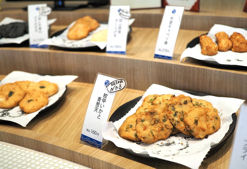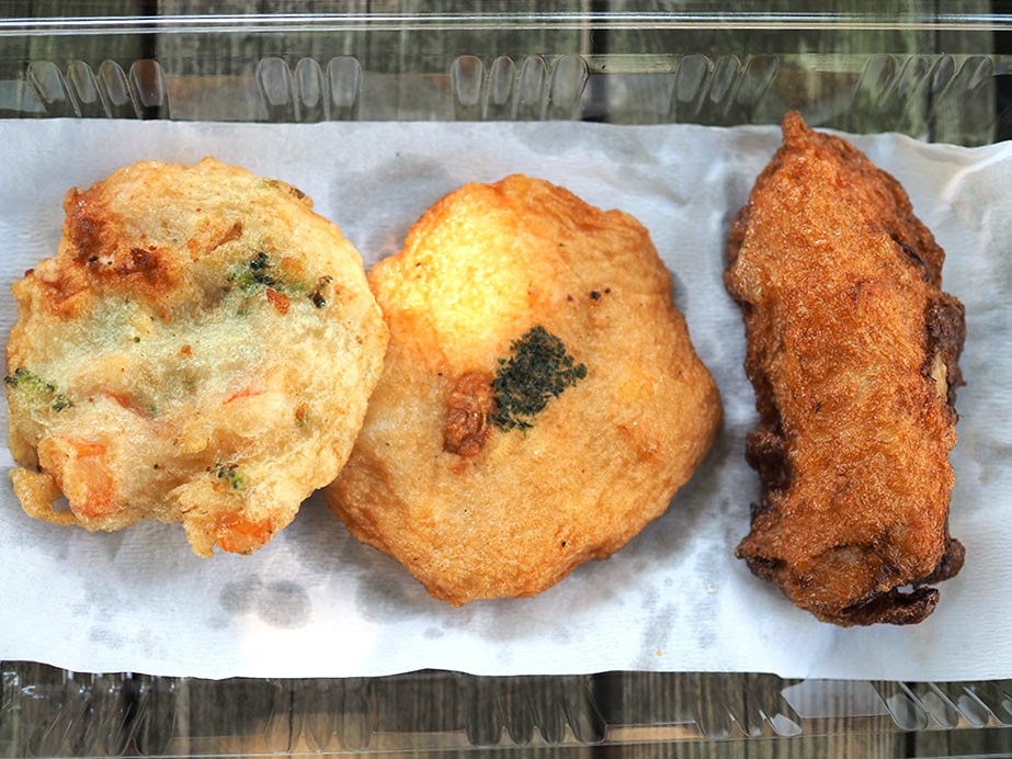 海老と青しその香り揚げ、濃厚チーズ天、今が旬のたまねぎ天(各税込160円)を食べてみました。ふわっとしたすり身に、それぞれの食材の香りがのってどれもとても美味しかったです。特にたまねぎ天のたまねぎは大ぶりでごろごろ入り、ジューシー。すり身とは違う食感に出会う楽しさがありました。
