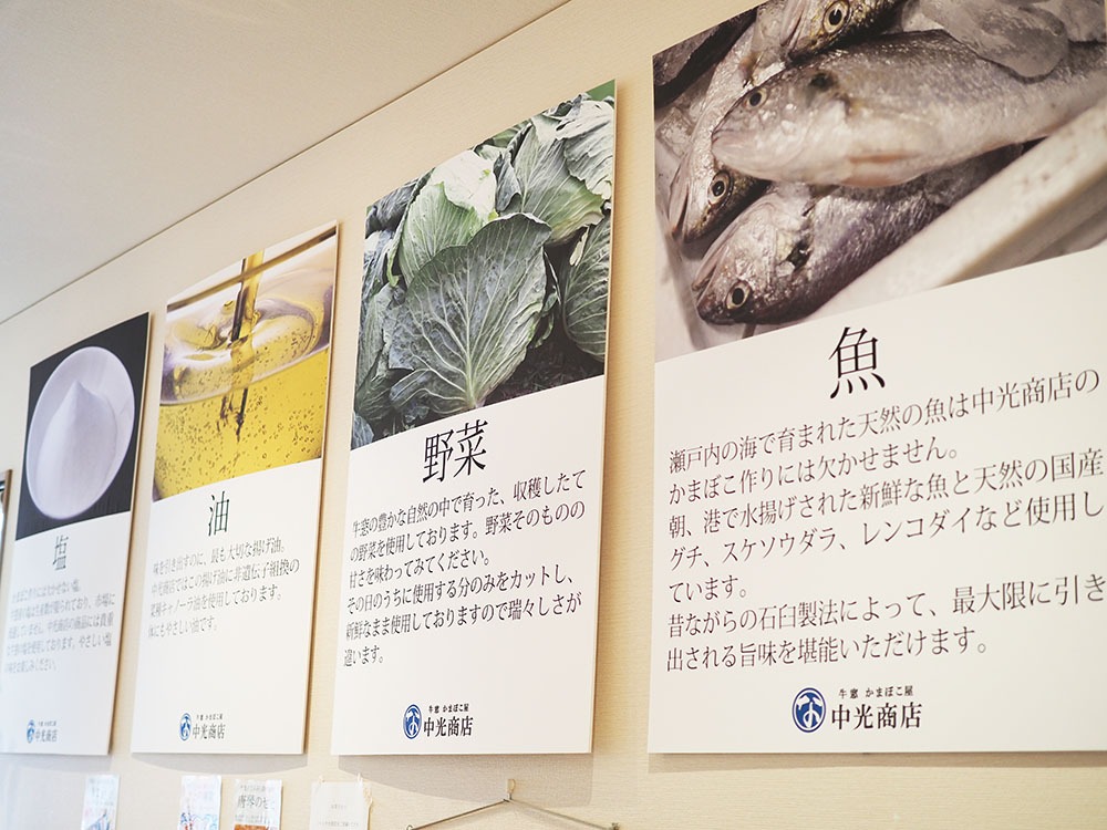 瀬戸内市の牛窓町と邑久町にある中光商店は1951年創業のかまぼこ屋。創業時から昔ながらの伝統技術「石臼づくり」で練り製品に使うすり身をつくっているそう。石臼に刻んだ魚などの材料を入れて、回転する棒でかき混ぜてつぶしていきます。大きな会社は石臼を使わず大量生産で作っていきますが、石臼を使うことで繊維が細かくなりすぎず空気が入り、ふんわりとした食感になるそう。その日の気温や使う魚の種類によって微調整を行う職人技です。