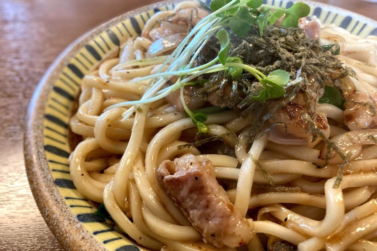 「お好み焼き くいしん坊」さんのホルモンうどんは、たっぷりの濃厚ダレでありながら、久米産のゆずが効いたさっぱりとした味わい。奥津産の姫とうがらしを使用した一味を加えることで、奥深い辛みを演出した一皿に。また、鉄板焼き屋さんということもあり、「ホルモンうどんモダン」といったホルモンうどんとモダン焼きがコラボレーションしたオリジナルメニューも多くの人に支持されています。