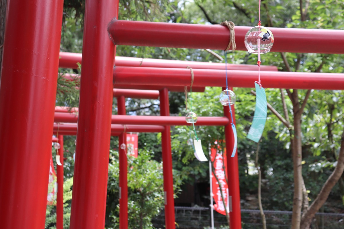 新緑のモミジに赤い鳥居と風鈴。引き込まれそうな、風情のある裏参道から、みんなで、一礼して鳥居をくぐり境内の入り口に向かいました。このロケーション、カメラ好きの方にはたまらないスポットです!!