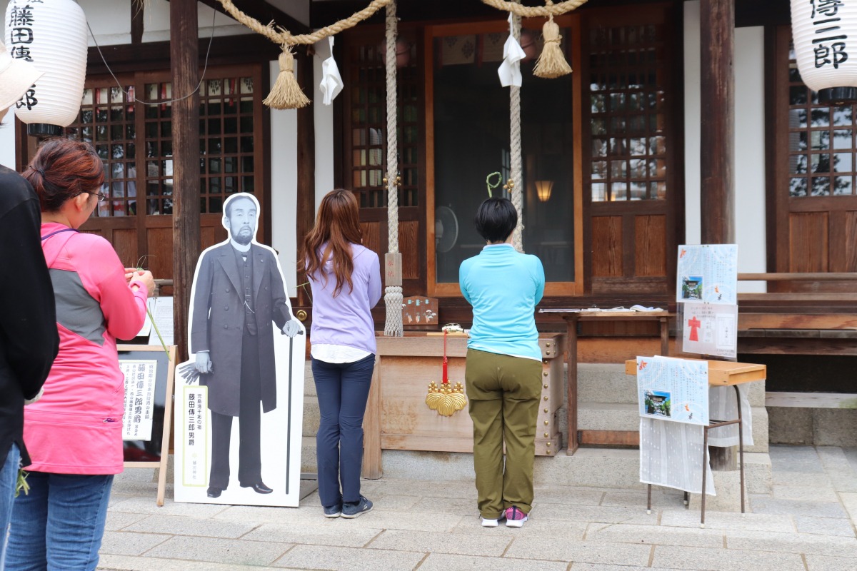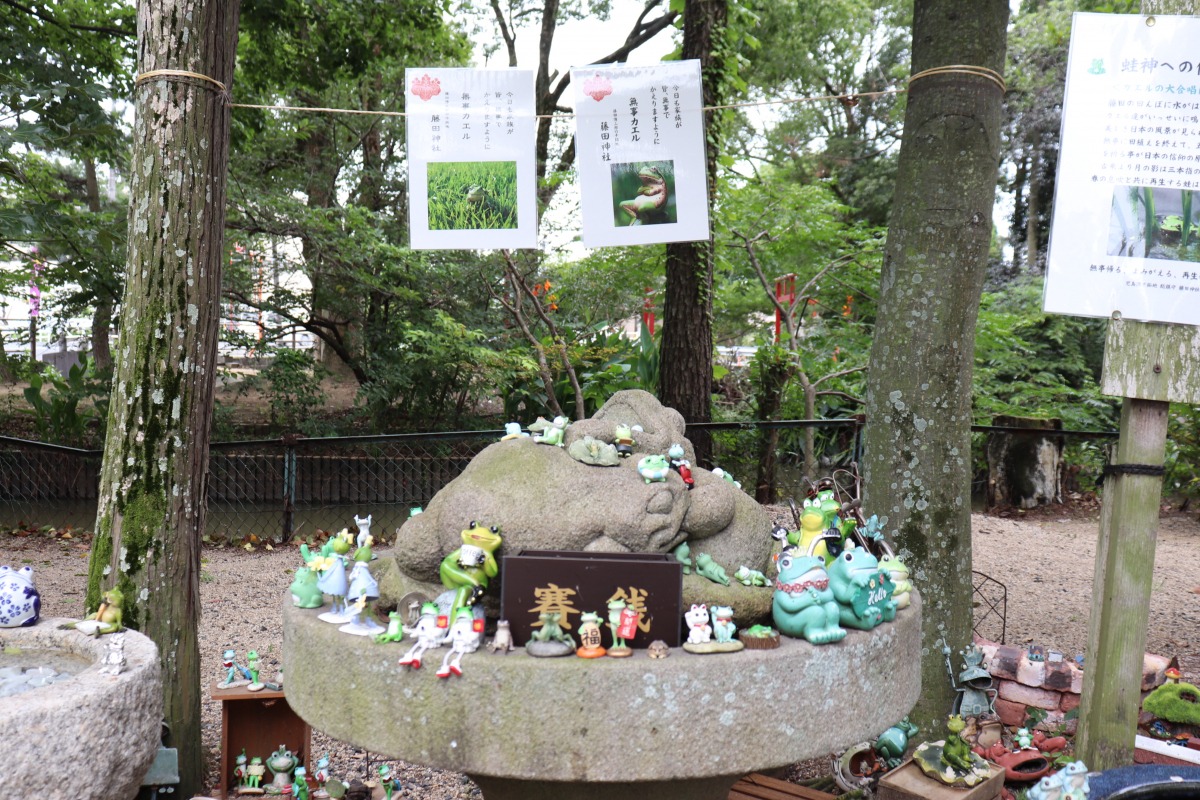 参道の途中にこんなかわいいカエルがたくさん祀られていました。無事帰る、よみがえる、カエルは再生の神様と奉納されています。