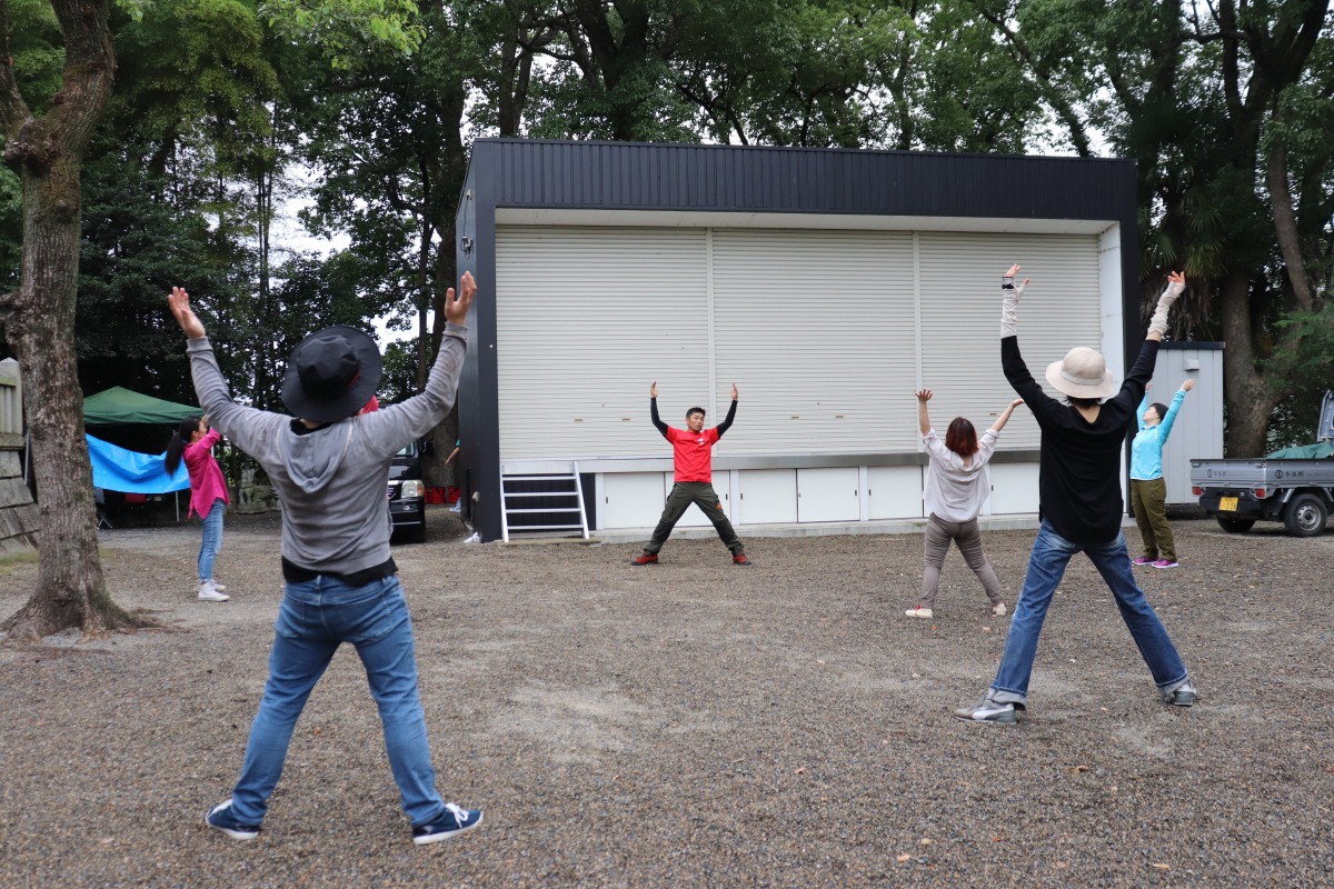 さあ、これからいよいよアクティビティのスタートです。まずは、準備運動の「もくもく体操」をみんなでしました。WENS代表の小野さんのリードで、「クスノキが風に揺れる~」と言われたら、みんなも揺れる~笑。真剣に体をほぐしました。