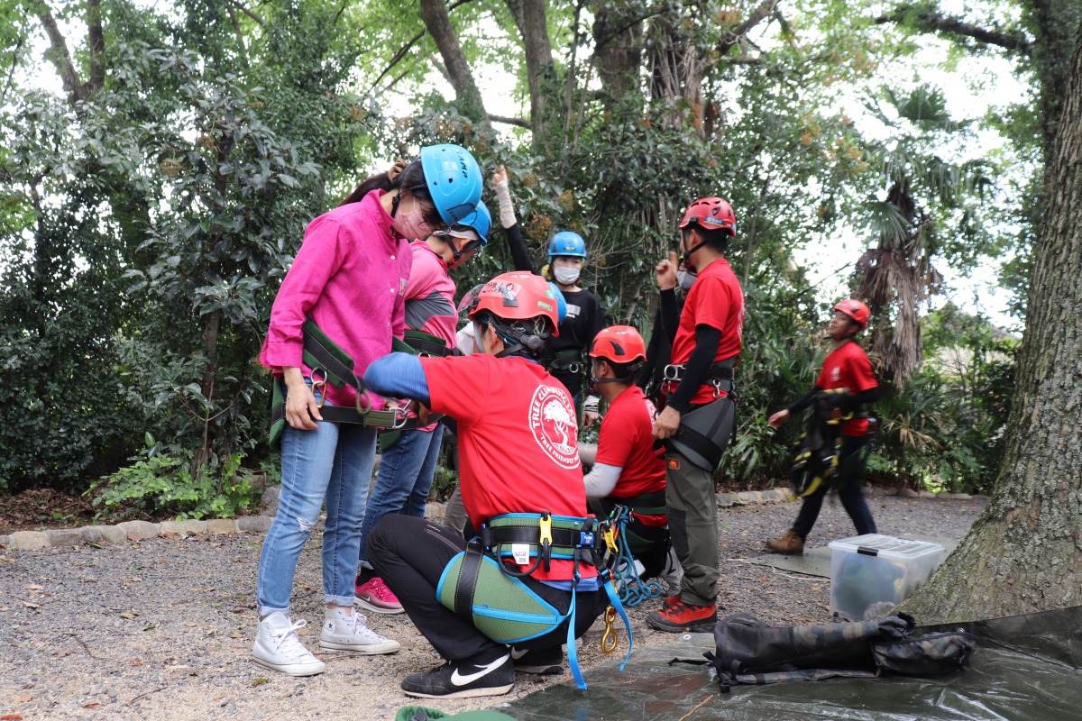 装具の説明を聞いて、スタッフの方に手伝って頂きながら装備しました。ヘルメットをかぶるので、頭にバンダナをまいてかぶります。私は髪が長いので一つに後ろでくくりました。服装は、長袖、長ズボン、滑り止めのついた手袋、スニーカー(サンダルやクロックスはNG)です。スタッフの皆さんがとても親切にお手伝いをしてくださいました。日本ツリークライミング協会の資格を持ったスタッフさんもいるので安心です。装具は、アメリカンサイズのS~Lまであります。