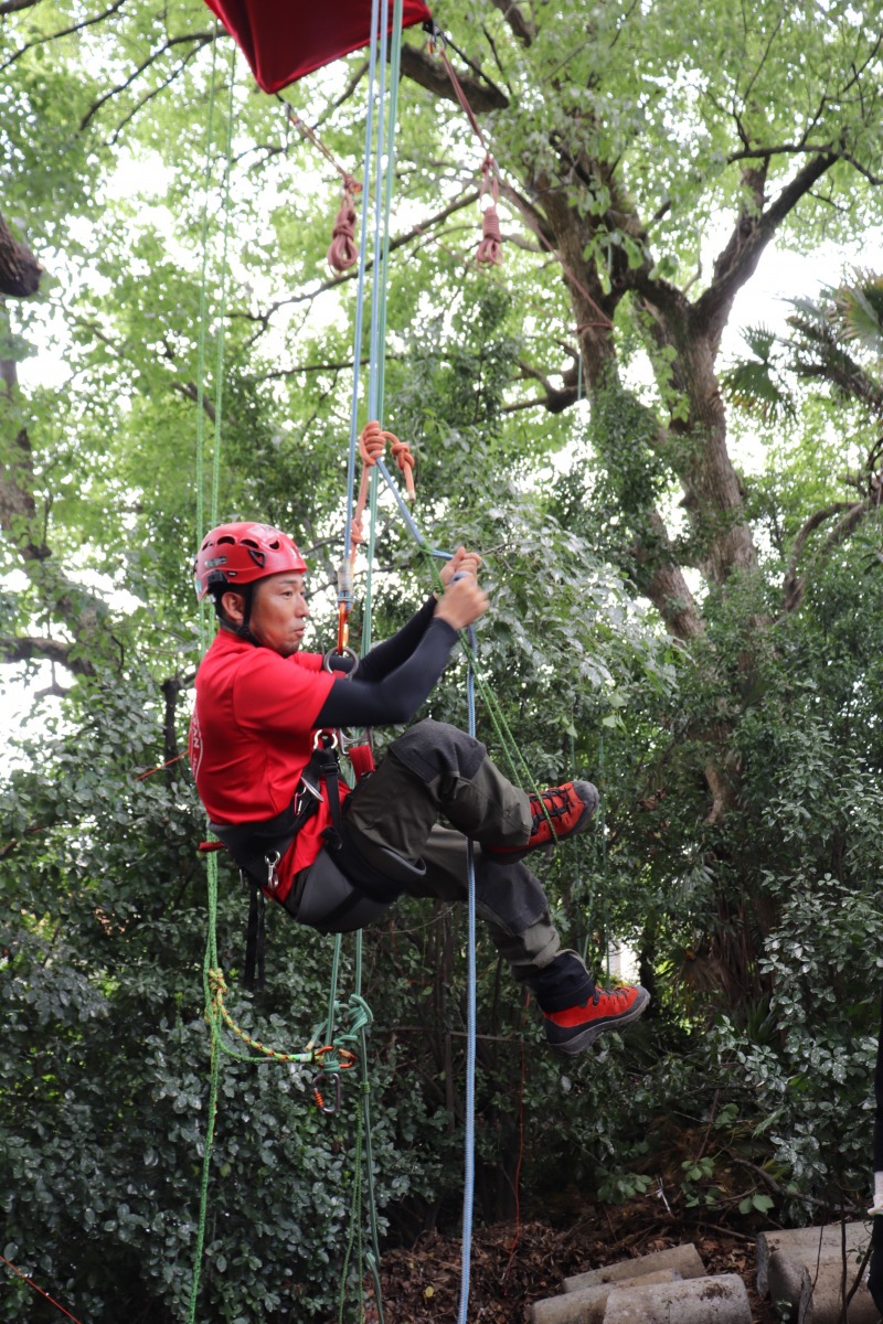 代表の小野さんは、高い木を自由自在に動かれていました。こんな空中ポーズも楽々とされていました。