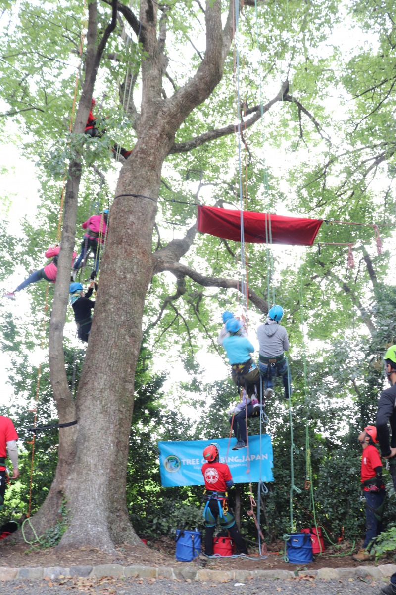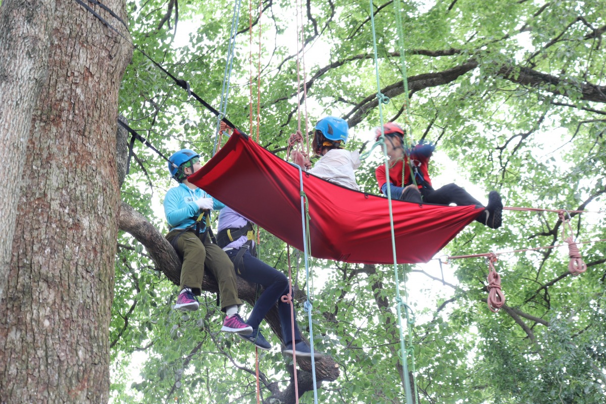 取材なので、皆さんが楽しむ様子をたくさん撮っていた私にも、待ちに待った登るときがきました。みんなの登る様子を見ていたので、頭の中では分かったつもりですが、最初はクルクル回ってしまいました。でも、すぐにコツをつかんでスルスル上に行けました。木に足を安定させて、ひもを操作するとうまくいきます。そして、高いところに登りついたら、別のロープで一眼レフを引き上げてくださるサポート付き。「カメラ~!」ここからは、樹上カメラマンです 笑。