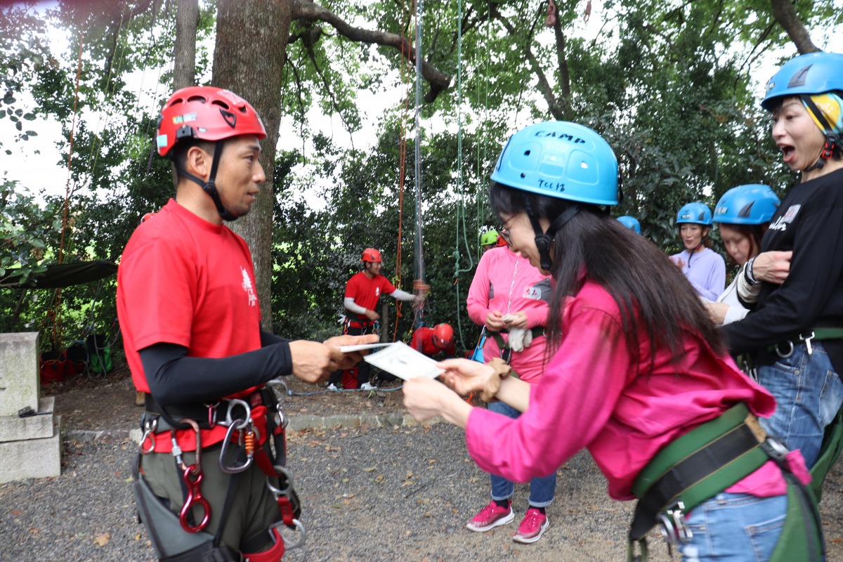 登るのは大変でしたが、降りるときは、スタッフさんが引っ張ってくださり、スルスルとあっという間に地上に着きました。気付かないうちに汗もかなりかき、気持ちもリフレッシュされ、いろんな意味でかなりのデトックス効果です。皆さん無事に終えることができ、最後にツリークライミング終了証を頂きました。初めての体験でしたが、親切に、細かくサポートしてくださるスタッフの皆様のおかげで、楽しく安全に森の体験ができました。林業に携わる方々のイメージもかなり変わり、親しみやすく、かっこいいと思いました。ぜひ、一度ツリークライミングを体験してみてください。