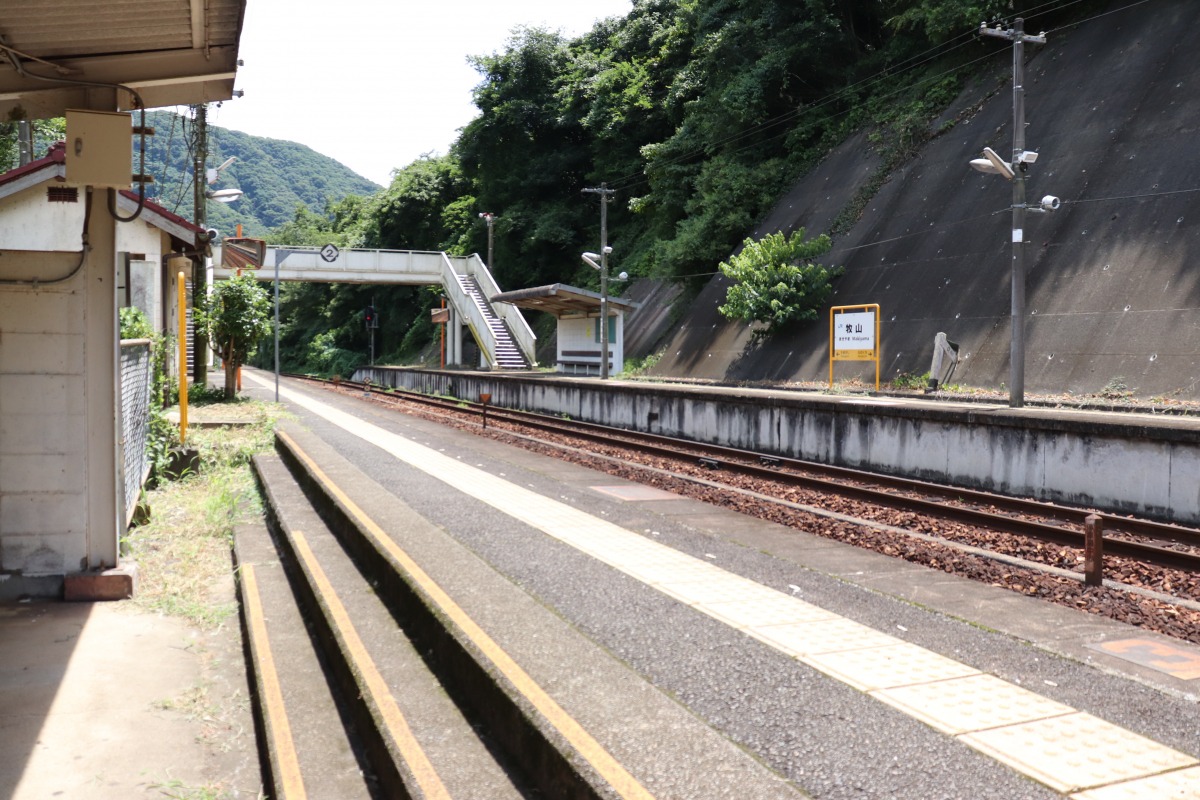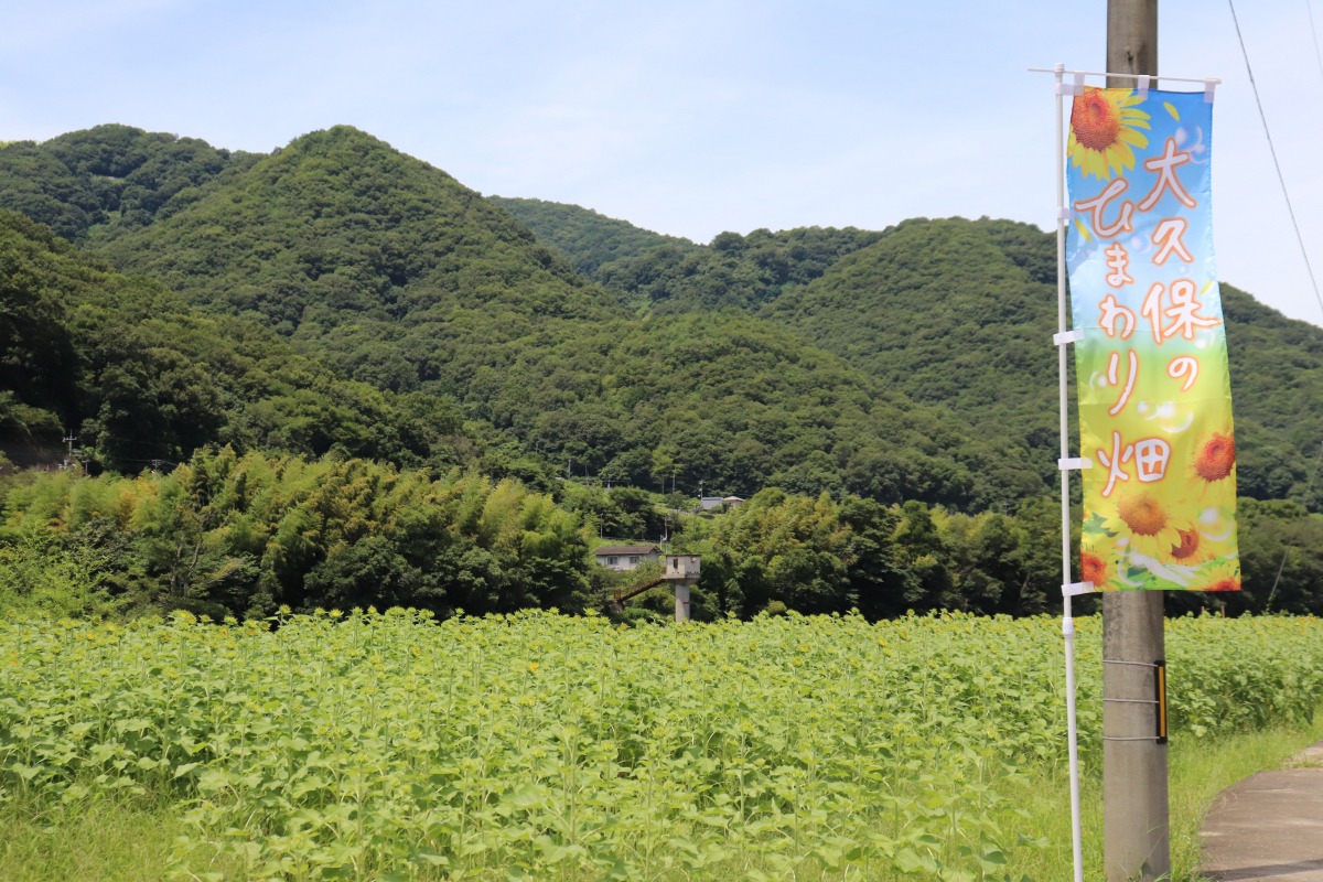 JR津山線の牧山駅を降りると、見渡す限り大きな山と川が流れる自然美豊かなエリアです。セミとウグイスの声以外は聞こえてきません。時おり走る津山線の電車の音のみが、時を知らせてくれる日本の原風景です。大久保地区のヒマワリ畑ののぼり旗を目印に道をわたり、橋を探しました。
