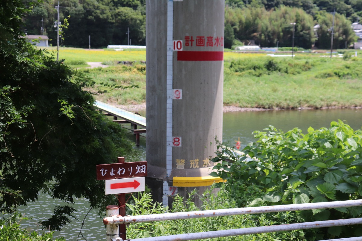 黄ニラ農家の山本ファームさんから、「潜水橋を渡ってすぐだから」と言われていたので、茂みを抜けて橋と見渡す限りイエローが見えた時は、うれしくなりました。目の前に立っている水位計で、西日本豪雨災害での浸水5mが想像できます。