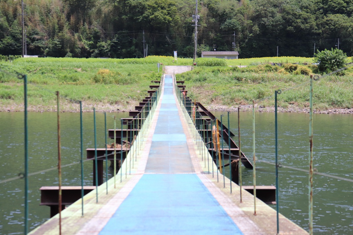 「潜水橋」というネーミングを聞いただけで、何か惹かれていました。梅雨時期、台風の時期は頻繁に沈むため、通称「潜水橋」と言われているそうです。そのまんま、期待通りの橋のネーミングに、ますます愛着がわきました。なんだか渡りたくなる橋のたたずまいに引き込まれるように、歩いてゆっくり渡りました。結構なスリルかもしれません。