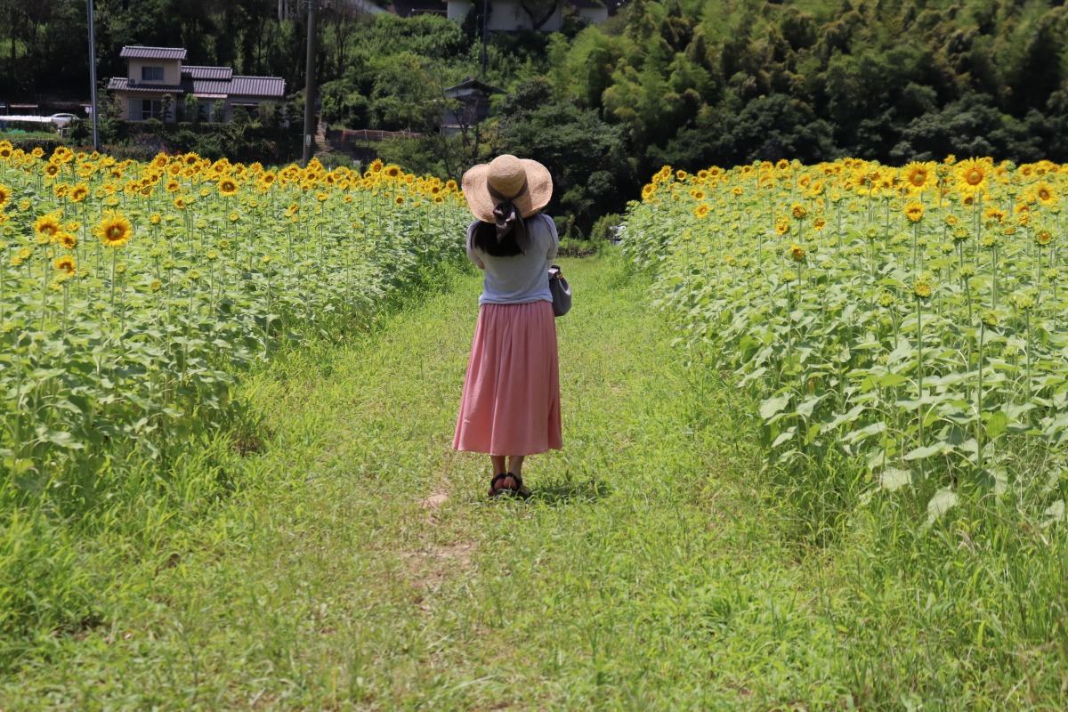 西日本豪雨災害の泥水が引いてからは、地域の方、ボランティアの方の手助けで、少しずつ元の畑の風景に戻っていったそうです。もともとこのエリアは、岡山の特産黄ニラの栽培がさかんでした。その黄ニラが、泥に浸かった土で発芽するのか試すために、その後肥料としても使えるヒマワリを発芽テストとして植えたのが、ヒマワリ畑の始まりだそうです。
