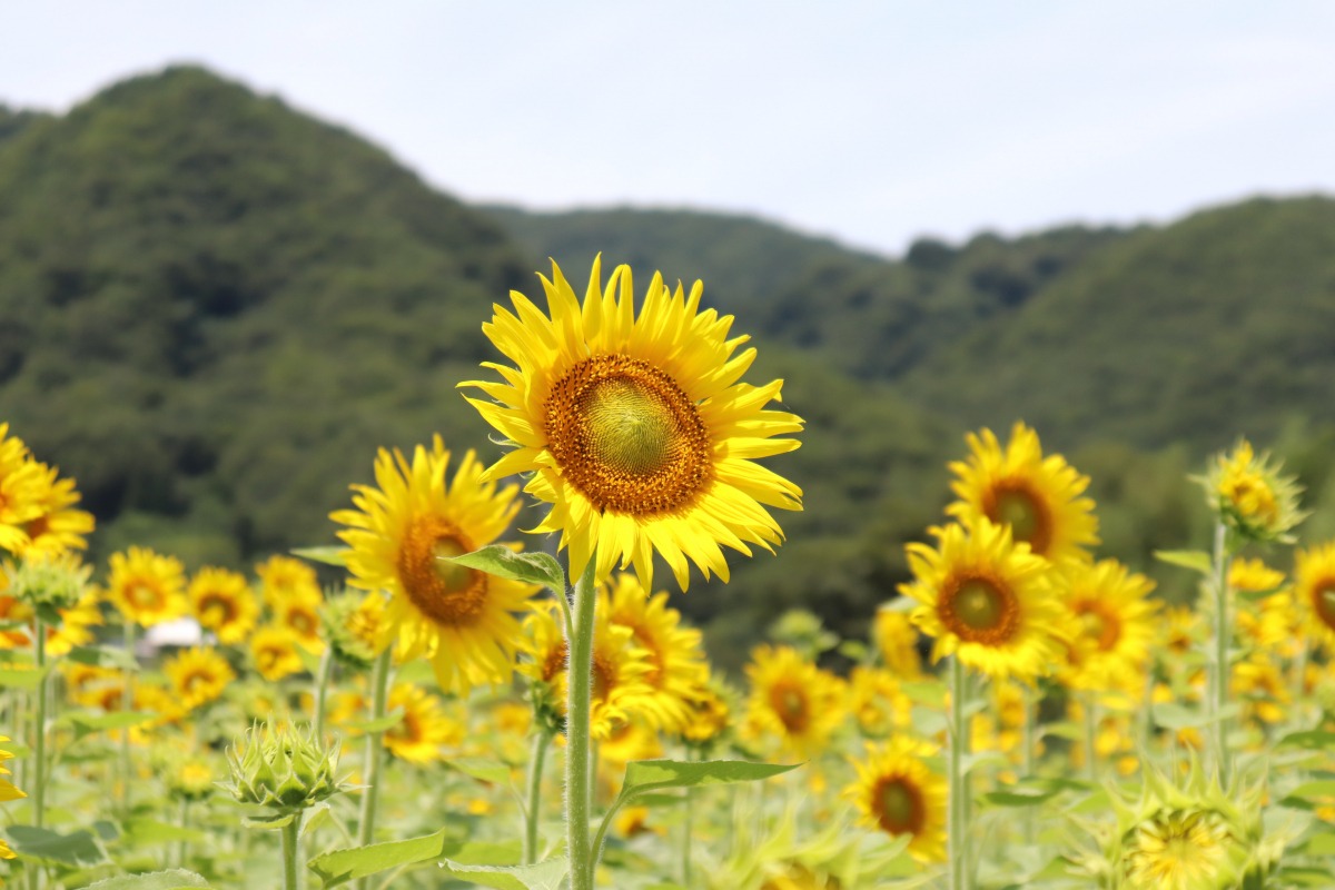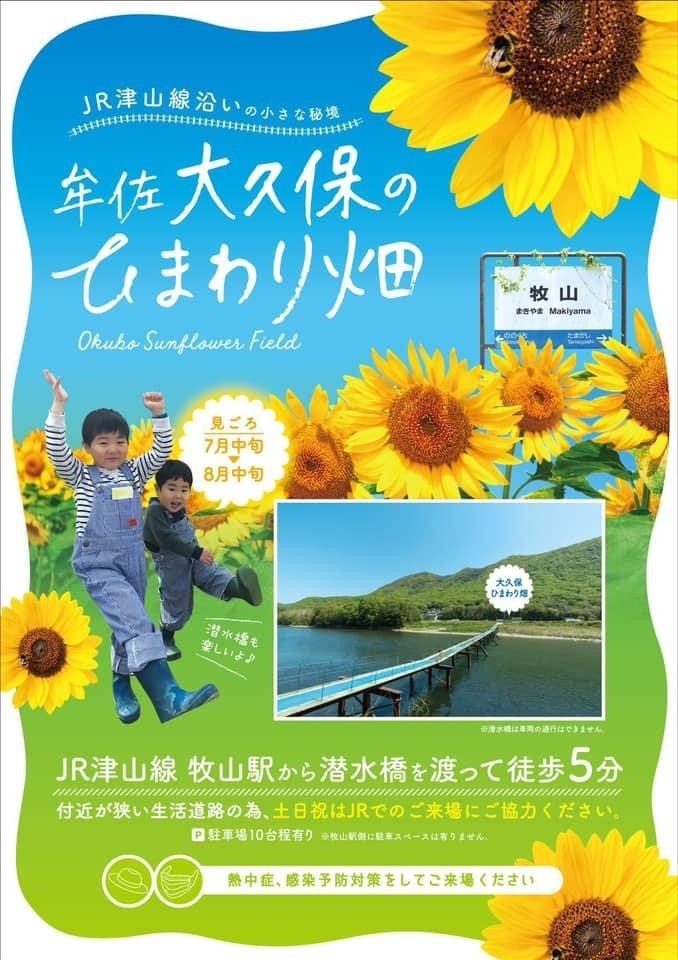 JR津山線牧山駅から徒歩5分、見渡す限りの山と大きな川が流れる岡山市北区牟佐の大久保地区のヒマワリ畑がきれいに咲き始めたので行ってきました。