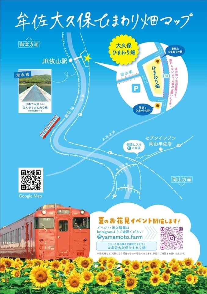 3年前の西日本豪雨災害で、目の前を流れる旭川があふれ、5mの浸水被害にあった大久保地区です。もともと黄ニラの生産が盛んなこの地区を、災害が泥とがれきの畑にしてしまいました。あれから3年、黄ニラの栽培のため、地域の復興のため、黄ニラ農家の山本ファームさんを中心にヒマワリ栽培が始まり、今年は昨年よりもバージョンアップしています。そして、見どころはもう一つ。ヒマワリ畑と駅を結ぶ潜水橋です。ノスタルジックな橋に、思わずカメラを向けたくなる風景がありました。