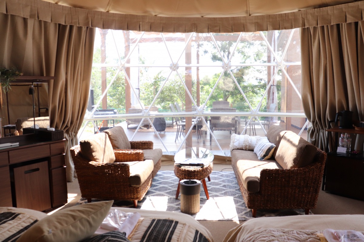 ドームの中は、防音シート、遮光シートで覆われているので、大変静かです。取材に行った日は、危険なくらいの暑さでしたが、ドームテントの中は、クーラーで涼しく、外のセミの音も聞こえませんでした。山の上に建つグランピングなので、外は、セミの大合唱が聞こえてきました。森の中にいるような感じなので、お昼寝するにもおすすめな空間でした。