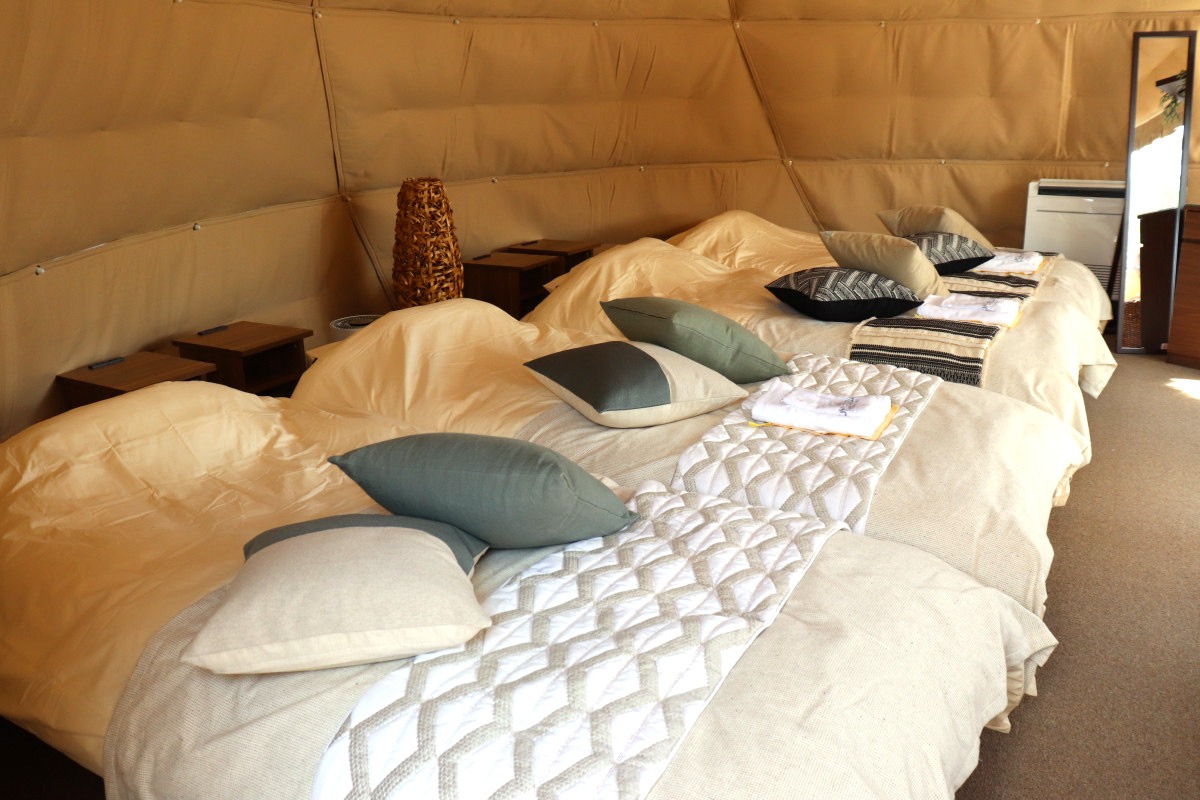 テント内は、全室冷暖房完備で、ベッド4台とソファがあり、冷蔵庫、ドレッサーも完備されています。