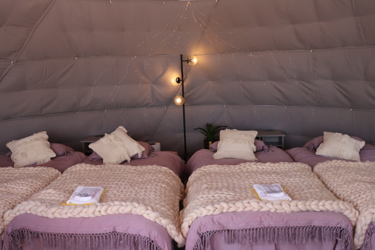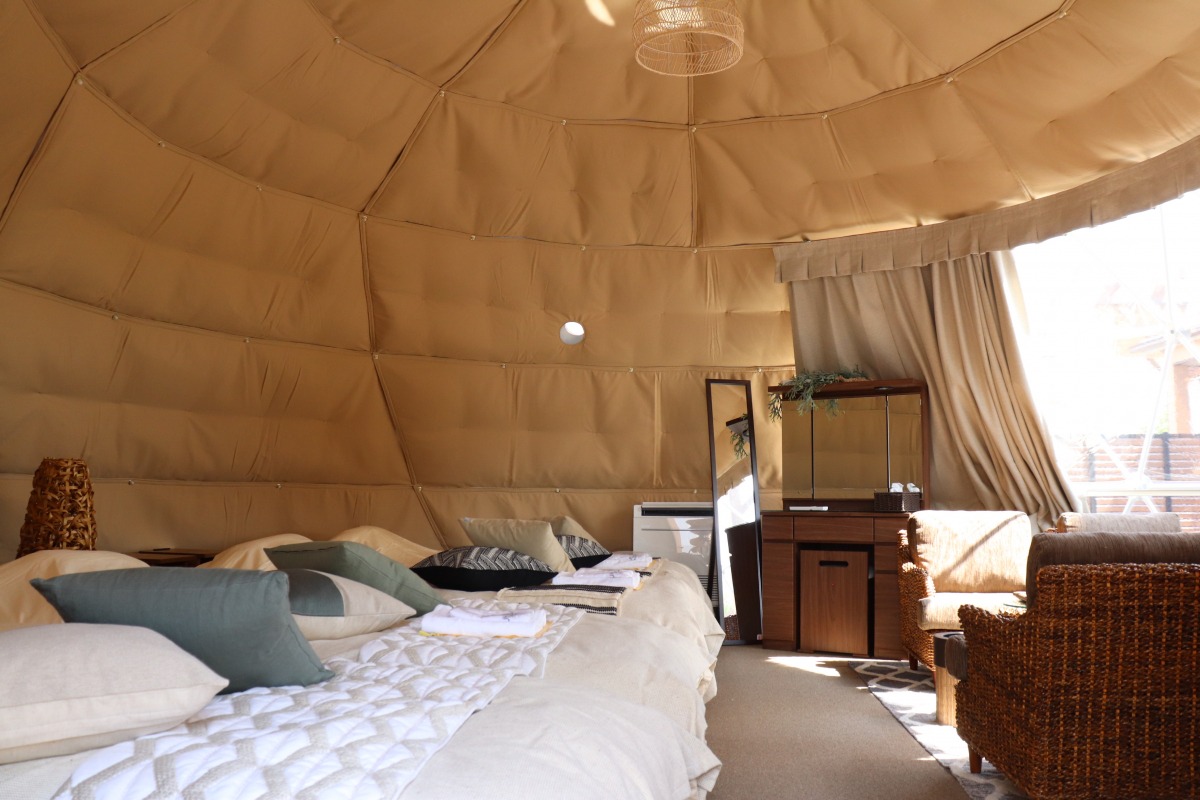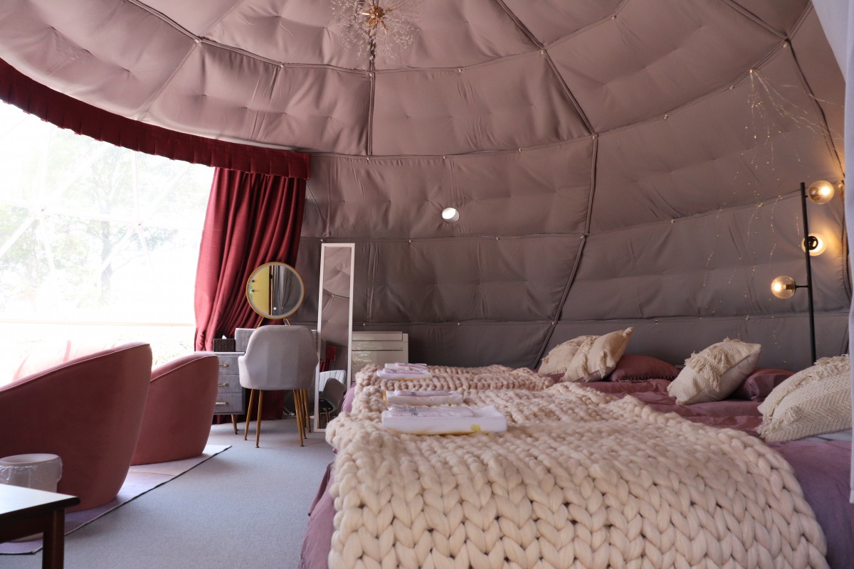 グランピング施設の一番奥の1棟は、華やかなヨーロピアンスタイルをイメージしたロマンティックフレンチのドームテントです。証明は、雑誌に出てくるようなライトで、はやりの落ち着いたピンクをベースに統一されています。ドレッサーもおしゃれでした。女性に人気が出そうです。