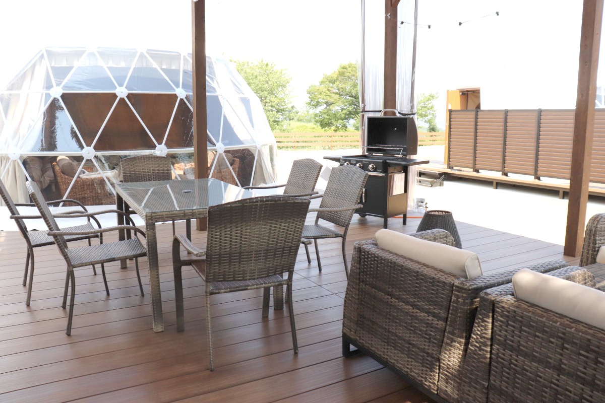 ドームテントの外には、スリッパのまま出れる広いテラスがあります。バーベキューコンロ、ダイニングテーブル、ソファー、水場と一通り揃っていて、スペースがかなり広いのでゆったりと過ごせそうです。屋根もついていて、風よけカーテンもあるので、少々の雨でも大丈夫そうです。