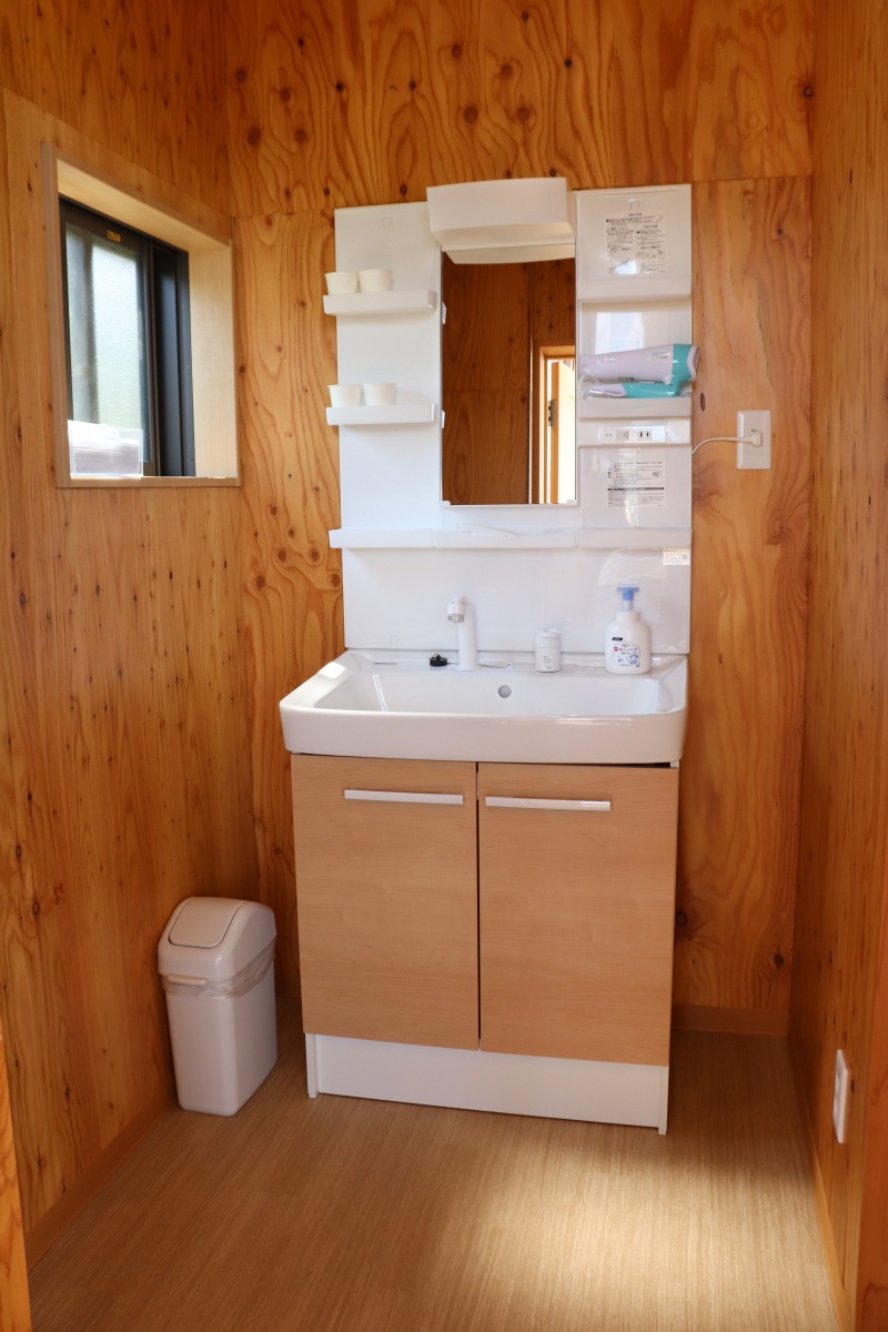 多くのグランピング施設には、案外、洗面所とトイレが離れた場所にありますが、全棟、テラス内に併設であるのは、大変便利だと思います。プールと大浴場は、本館にあります。