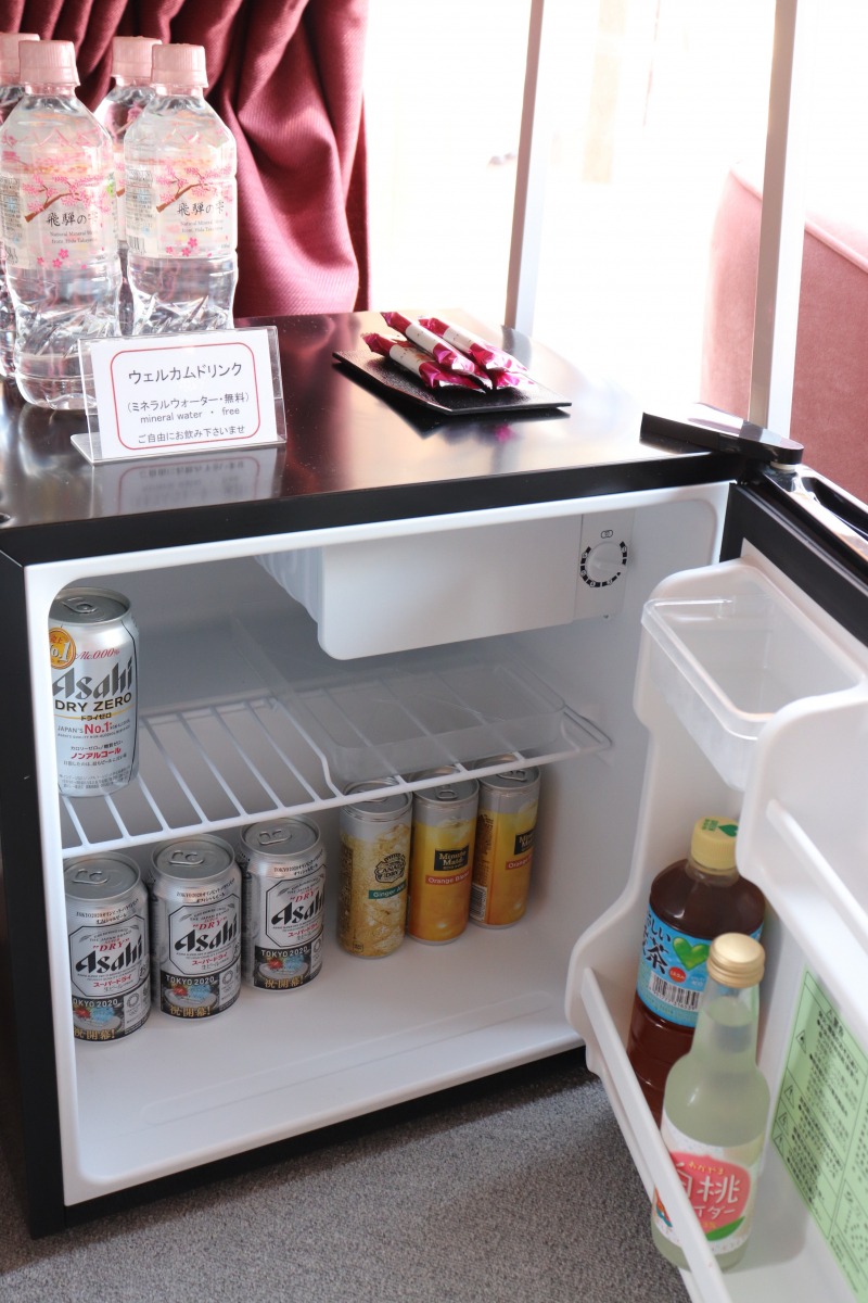 どのお部屋にも冷蔵庫がありますが、カップは、お部屋の雰囲気に合わせたものが置いてあります。ウェルカムスイーツは、岡山ならではの桃のお菓子が置いてありました。ミネラルウォーターまでピンクでした。そして気になる冷蔵庫の中を覗いてみました。