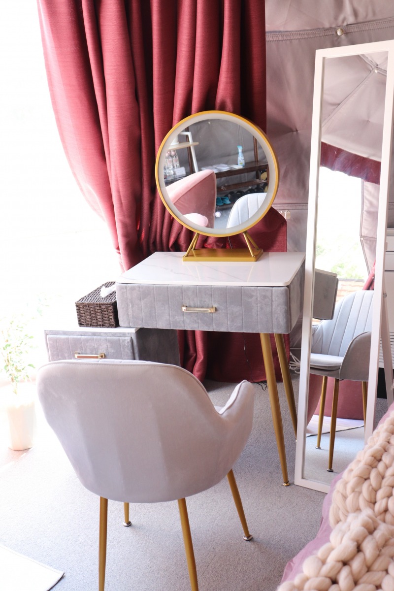 ドームテントに入って、目に飛び込んできたのが、可愛いドレッサーでした。大浴場に入って、テントに戻ってゆっくりと髪を乾かしたり、お化粧できるっていいですね。