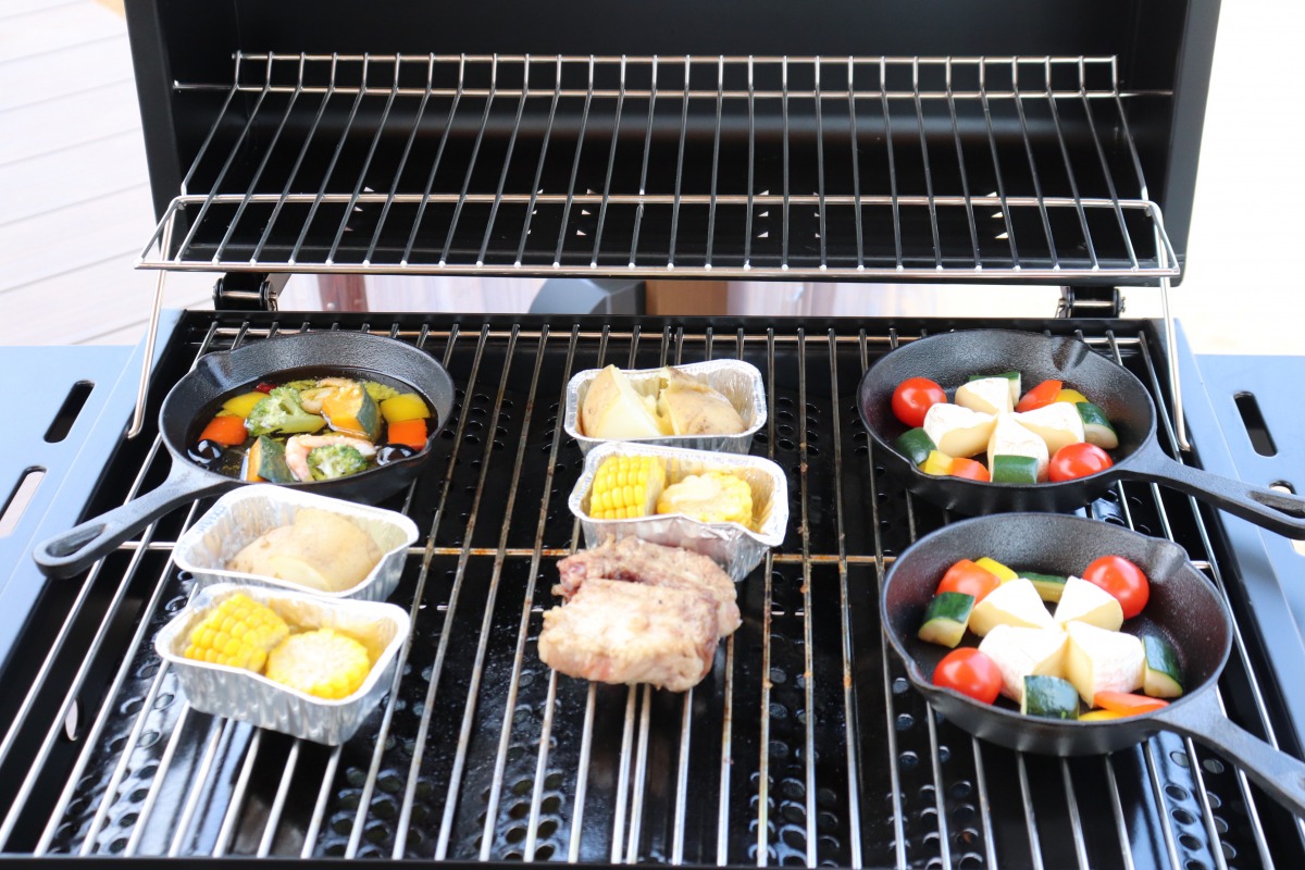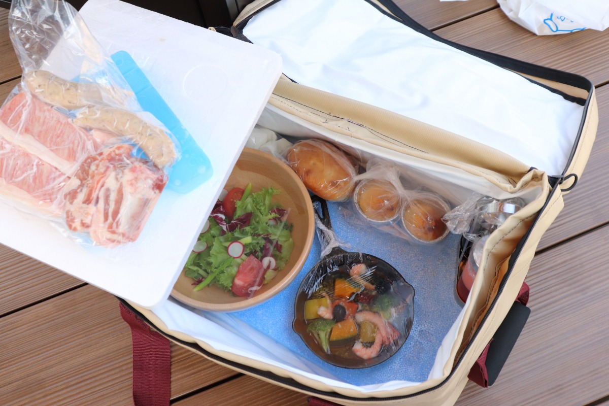 バーべキューコンロに火をつけて、保冷バッグから材料を出して、ラップを取って温めれば食べれます。コンロの蓋を閉めれば早く出来上がります。新鮮なお野菜はほんのり甘く、お野菜本来のお味が美味しかったです。オリーブオイルのアヒージョは、フランスパンにつけて食べると美味しく、ワインにも合いそうでした。