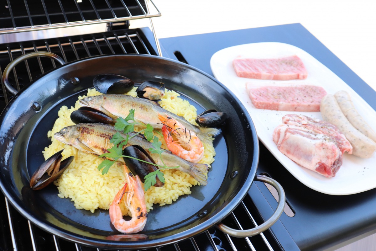 牛肉は、割と早く焼けました。お肉を焼きながら、端の方でパエリアを温める、という風にすると効率的でした。お肉は、柔らかくて、お腹が膨れました。パエリアにのっているアユは、近くを流れる一級河川の高梁川で採れた魚だそうです。ここでしか味わえないかもしれない美味しさです。